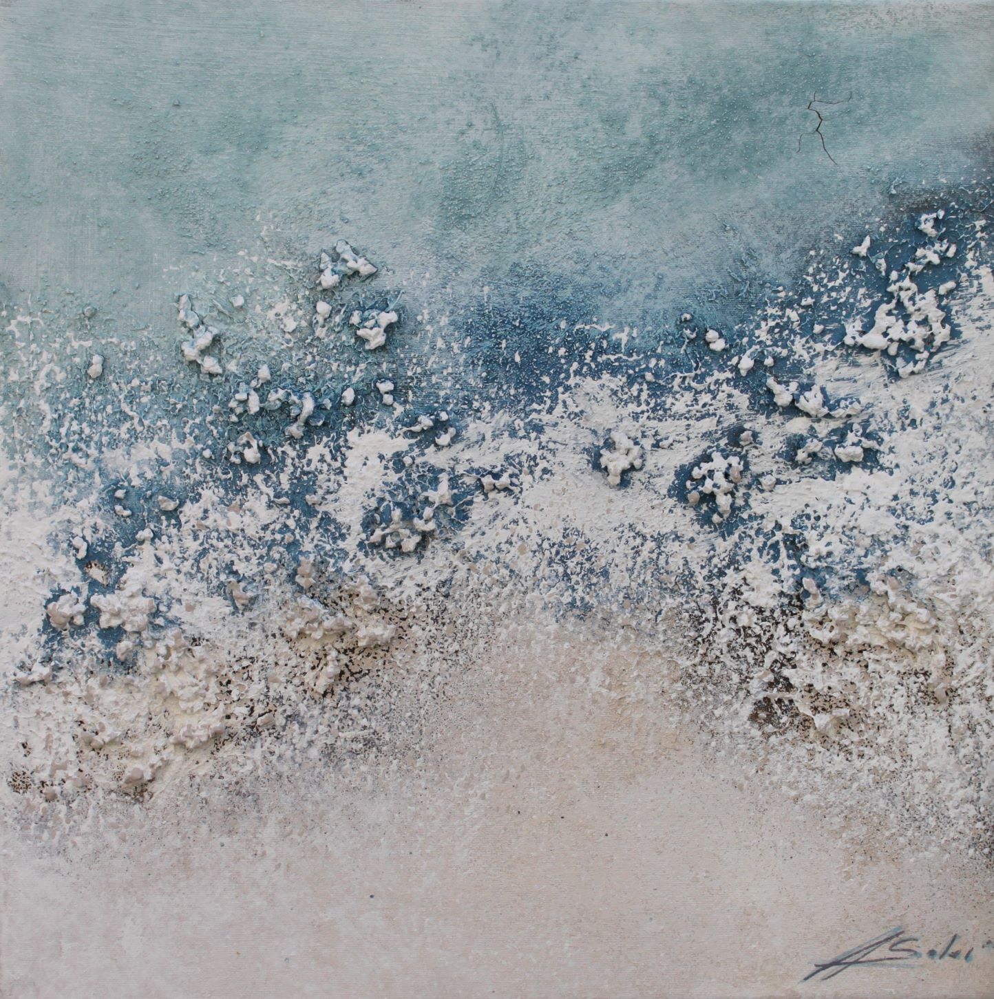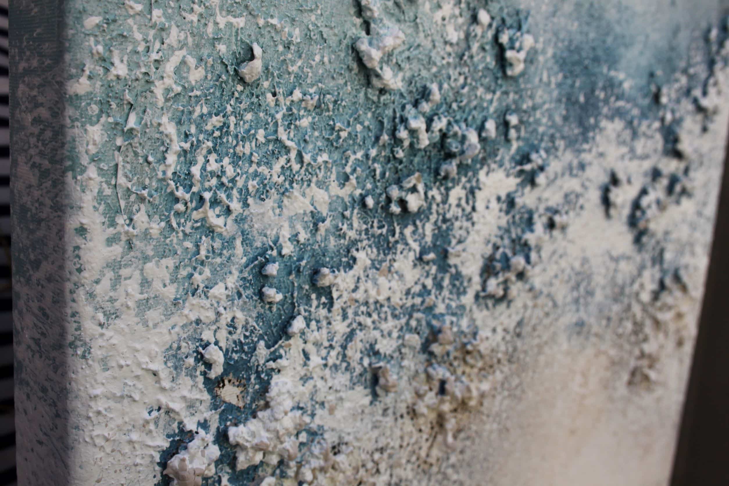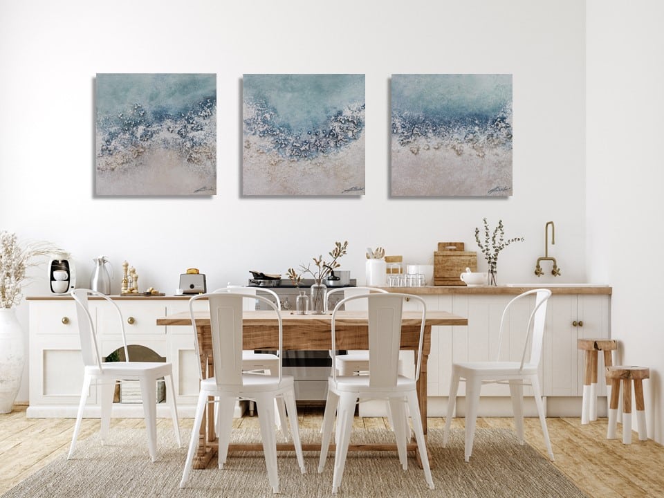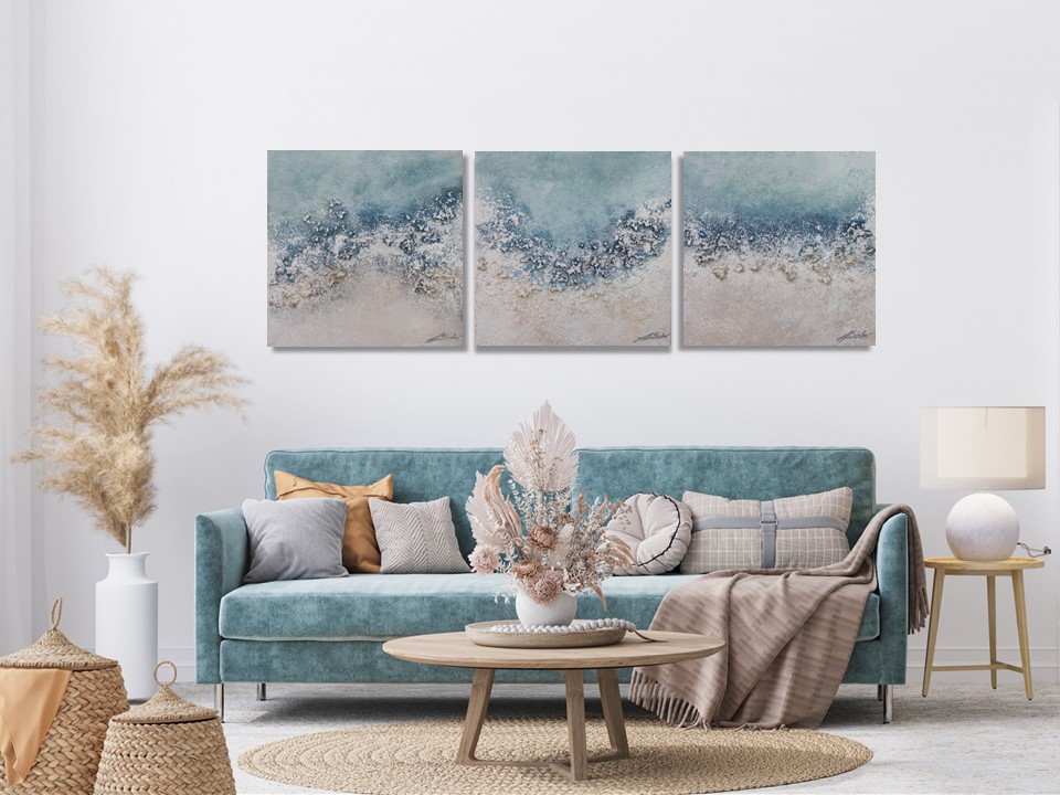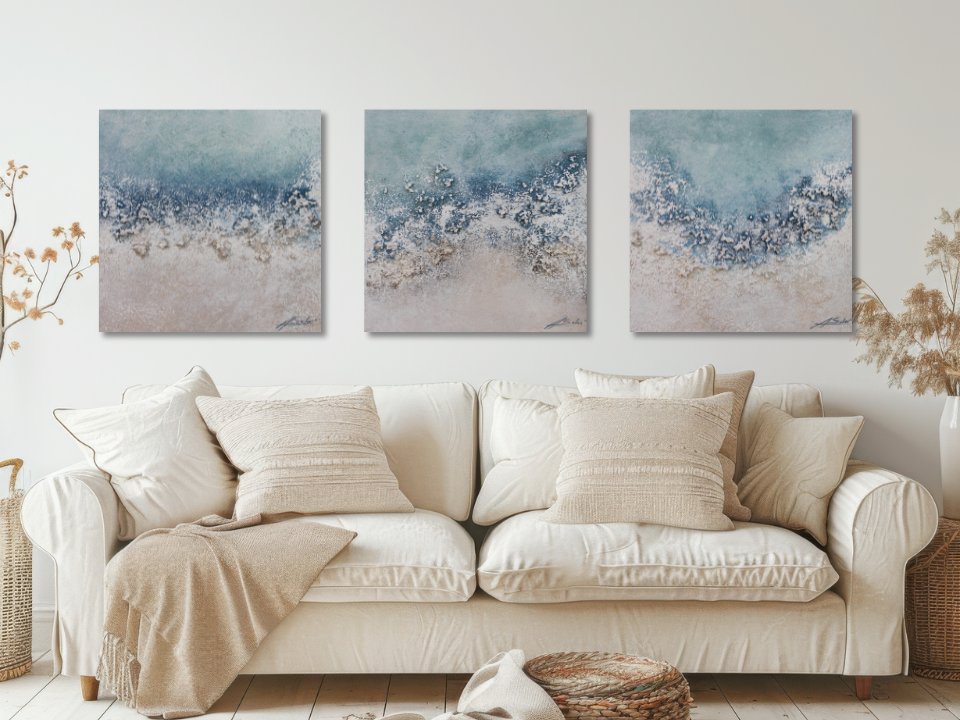 Tres cuadros pintados a mano en acrílico sobre lienzo. Totalmente acabados y montados, listo para colgar en su pared, con mucha textura arenosa combinada con masillas plásticas. Predominan los colores azules y blancos con ligeros toques de arenas, difuminándose entre ellos. Acabado mate sin brillo