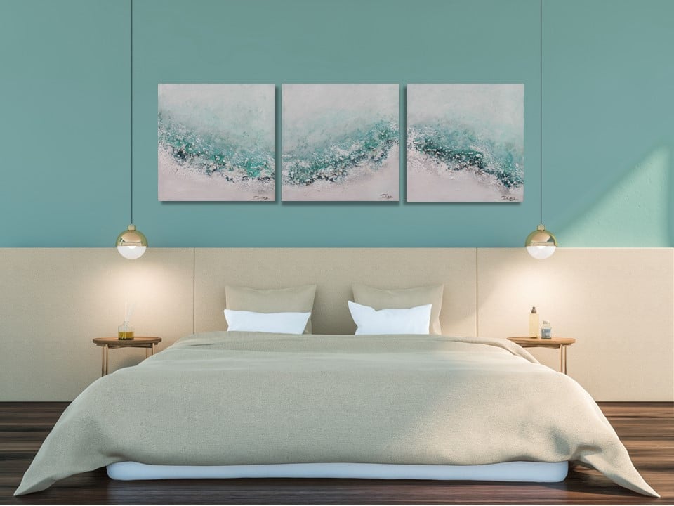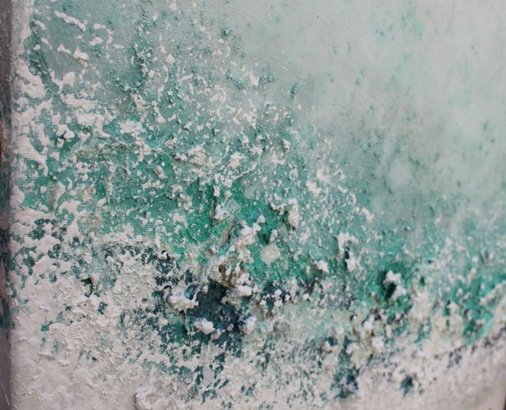 Tres cuadros pintados a mano en acrílico sobre lienzo. Totalmente acabados y montados, listo para colgar en su pared, con mucha textura arenosa combinada con masillas plásticas. Predominan los colores verde turquesa y blancos con ligeros toques de arenas, difuminándose entre ellos. Acabado mate sin brillo