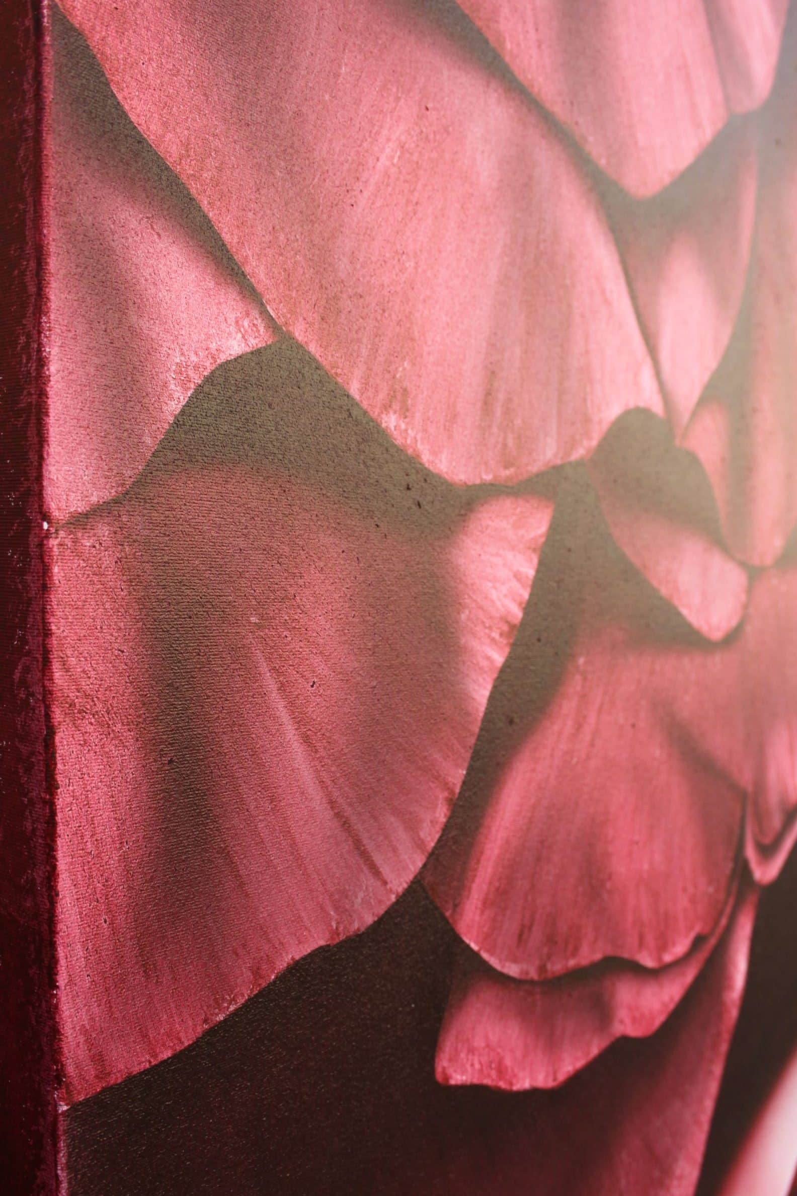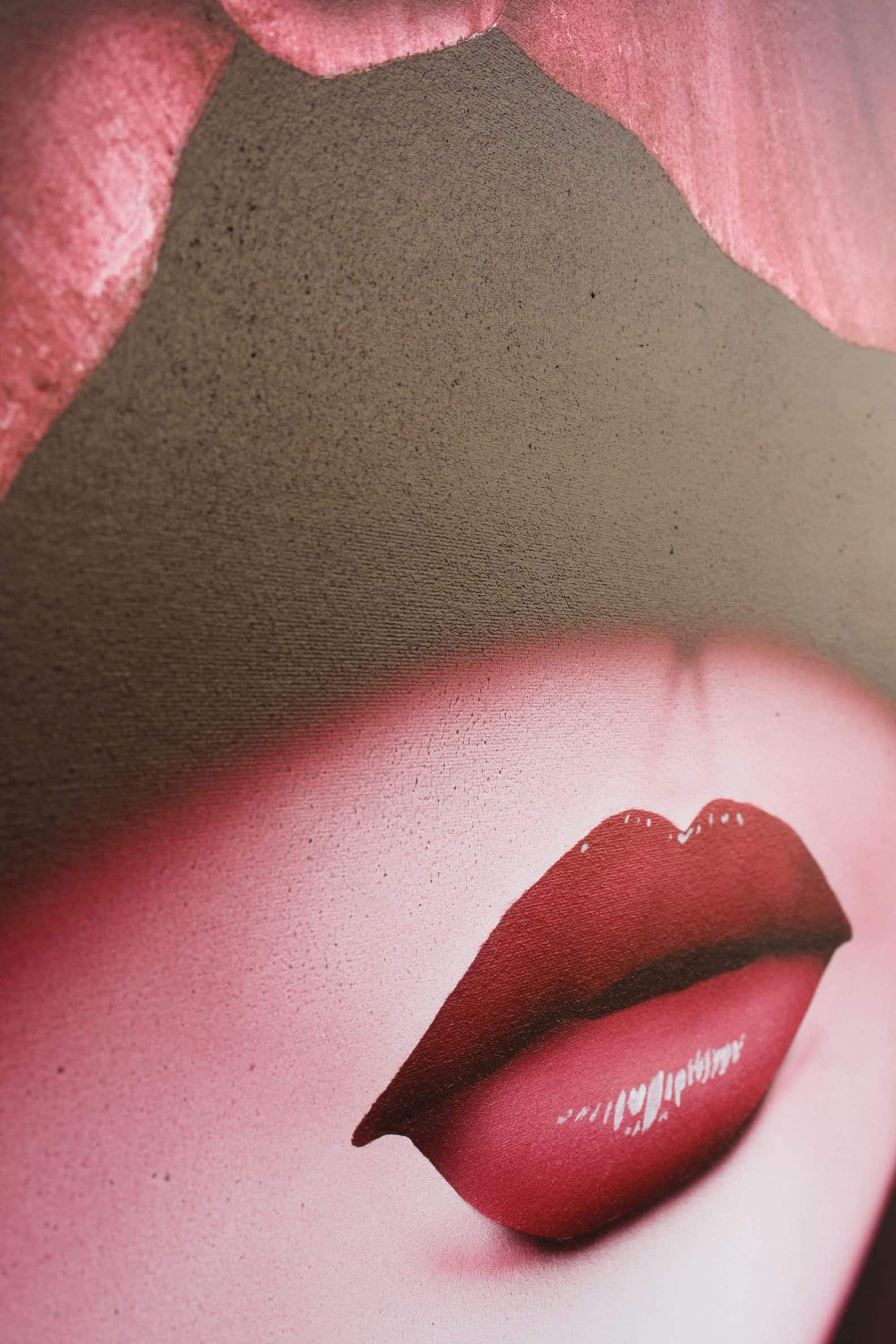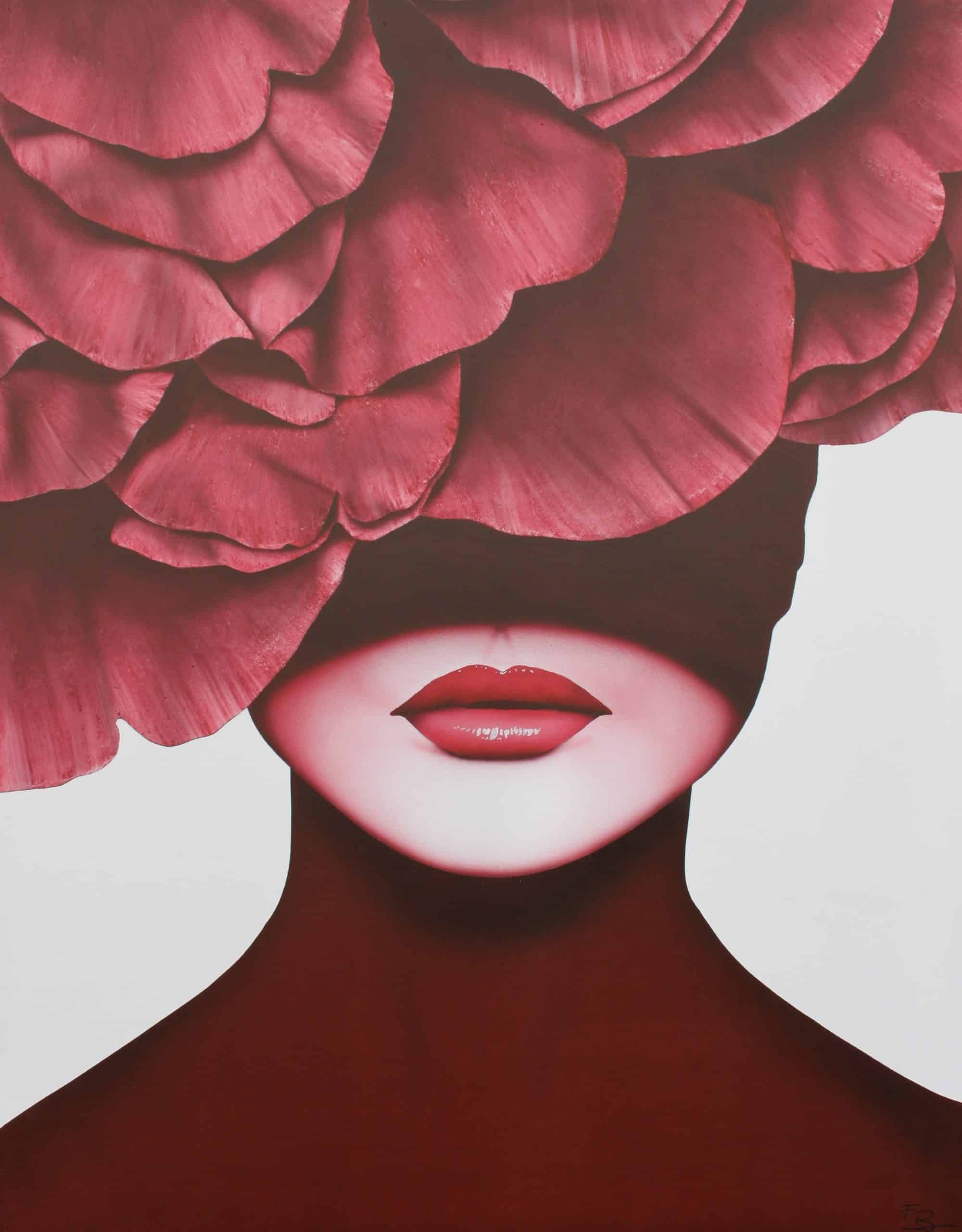 Obra muy elegante de una figura femenina, nítida y definida, destacando sobre un fondo que podría ser blanco, negro o una combinación de ambos. Los detalles están cuidadosamente trabajados con aerógrafo, creando una sensación de delicadeza y precisión. La elección del rojo para diferentes partes del cuadro añade un toque de dramatismo y sensualidad, convirtiéndola en la pieza central de la composición.