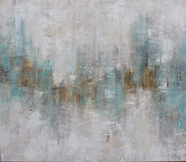 Cuadro original pintado a mano sobre tela, en tonos gris claro, topo, blancos y verde agua, con pinceladas en marrones y toques de pan de oro. Obra con textura que combina el pincel y la espátula, creando formas espectaculares. Gran Plasticidad y Diseño en la obra abstracta