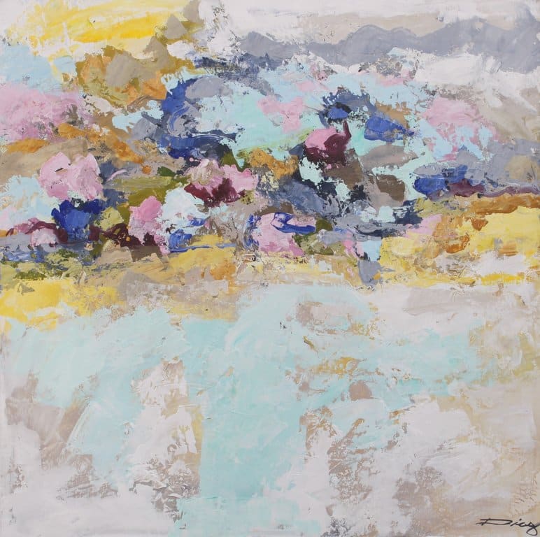 Cuadro original pintado a mano en acrílico sobre lienzo, con texturas. De gran colorido y viveza, mezclando colores pastel, ocres, amarillos, rosas, turquesas…