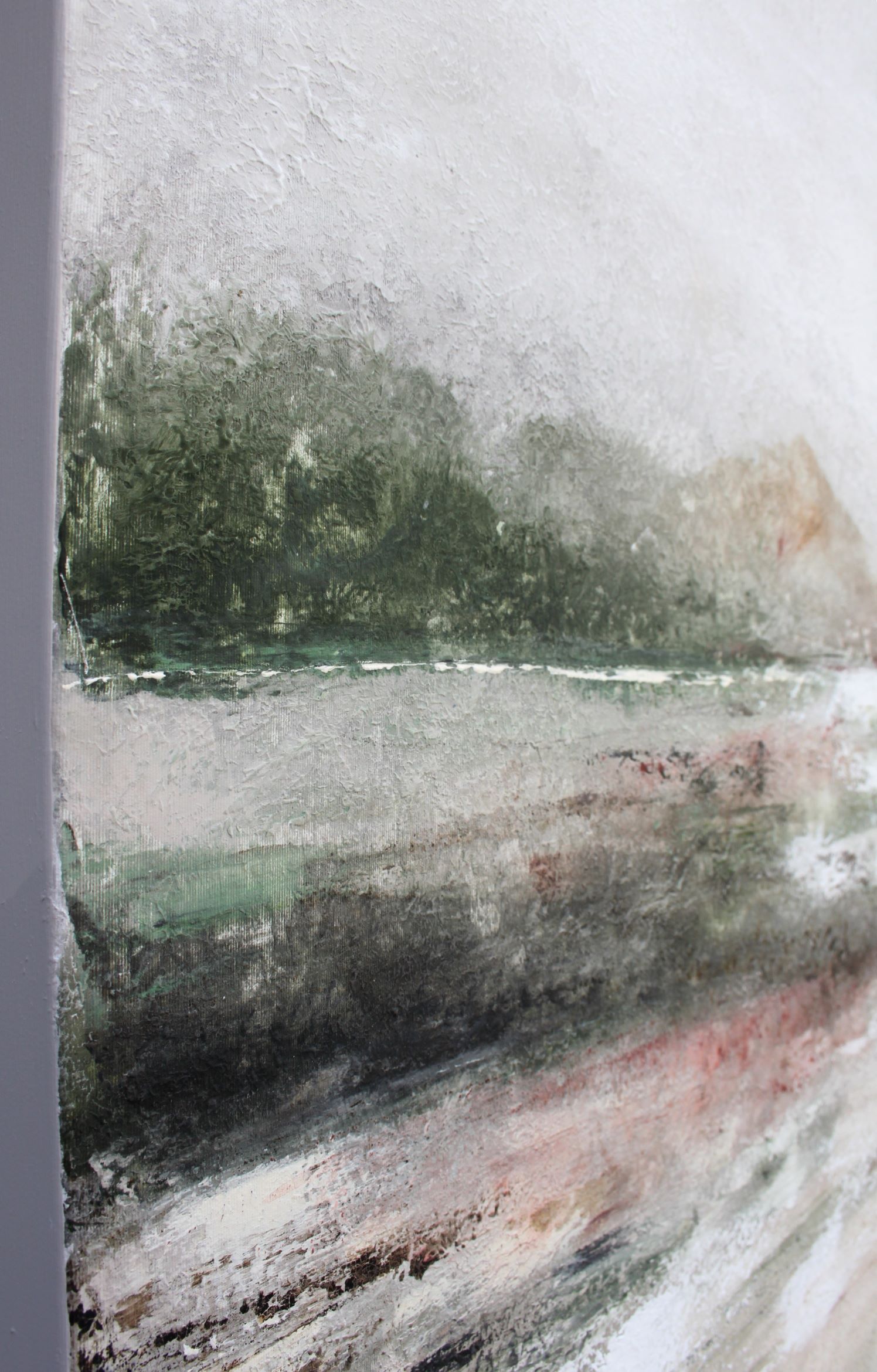 La pintura presenta una textura suave y velada, con pinceladas delicadas que crean una sensación de ligereza. Pintado a mano en su totalidad