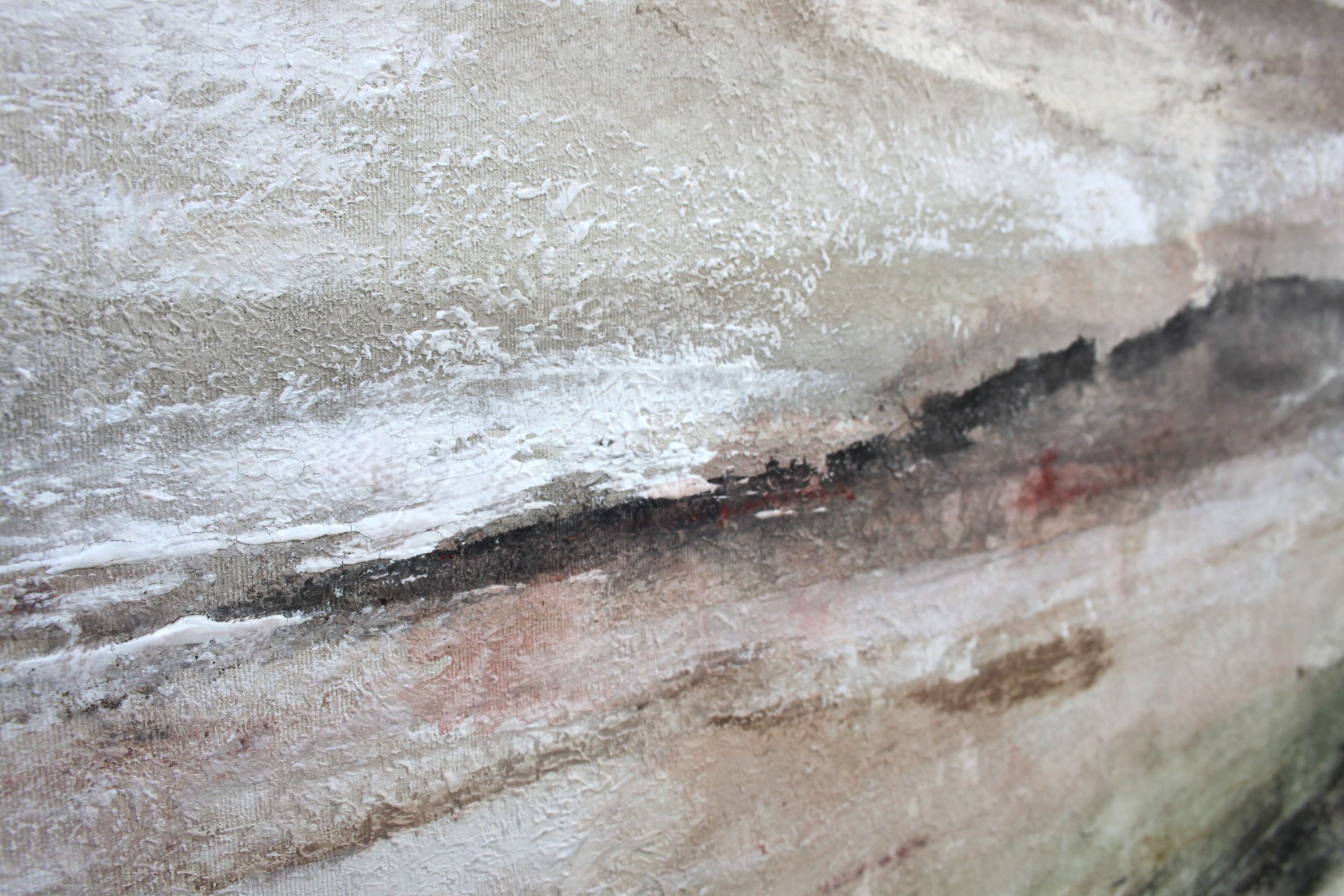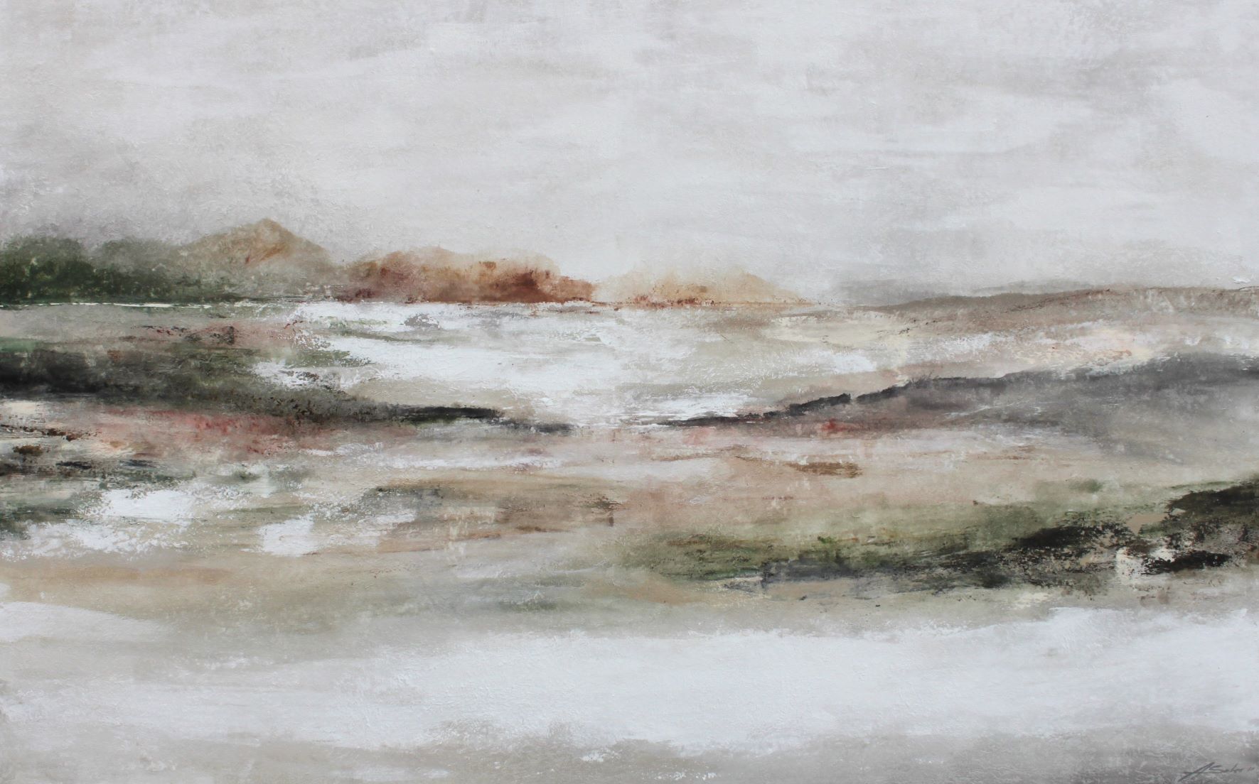 Las formas son abstractas y orgánicas, sin representar objetos reconocibles. Se aprecian líneas horizontales que sugieren un paisaje o un horizonte.