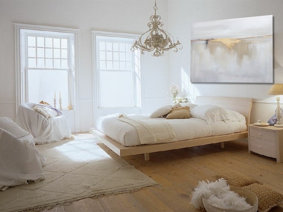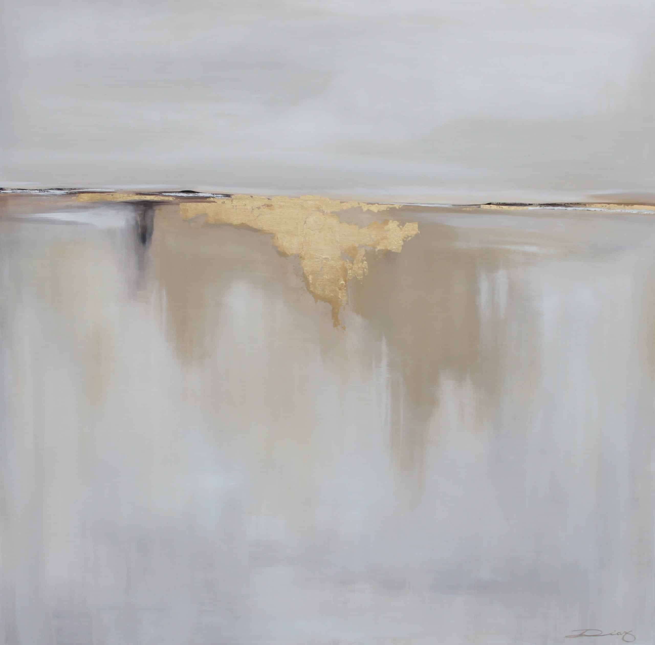 Cuadro original pintado a mano en acrílico sobre lienzo con texturas. Los colores blancos rotos y beiges, con toques sutiles de Pan de Oro, le dan una textura especial