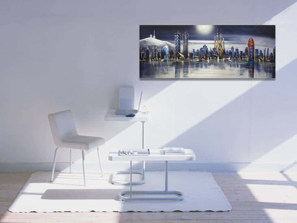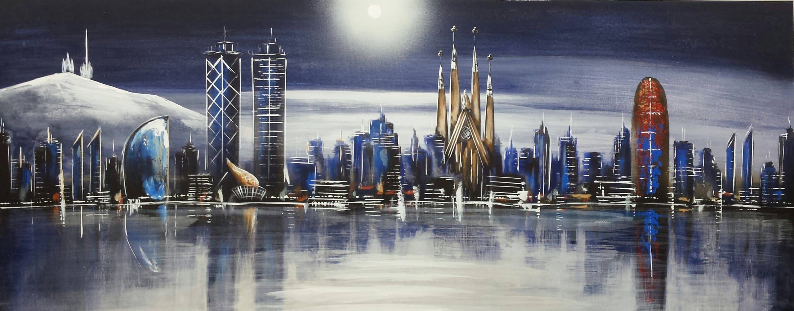 Cuadro original pintado a mano sobre tela en tonos variados. Cuadro Skyline Barcelona Ciudad