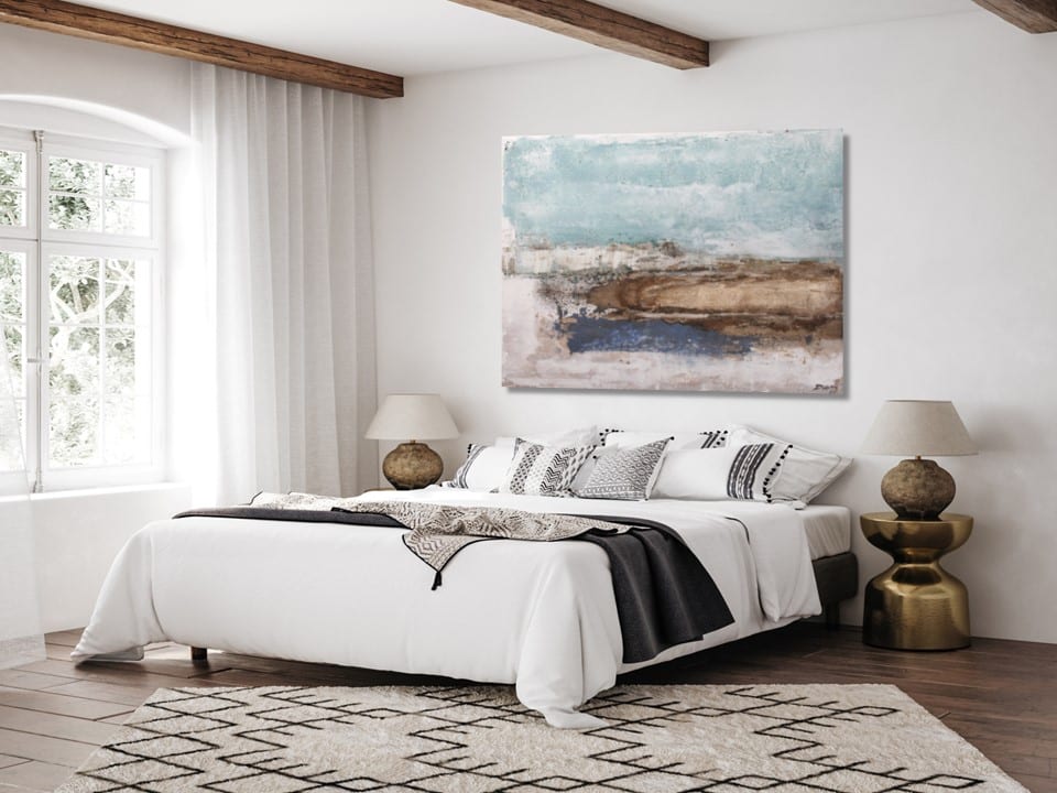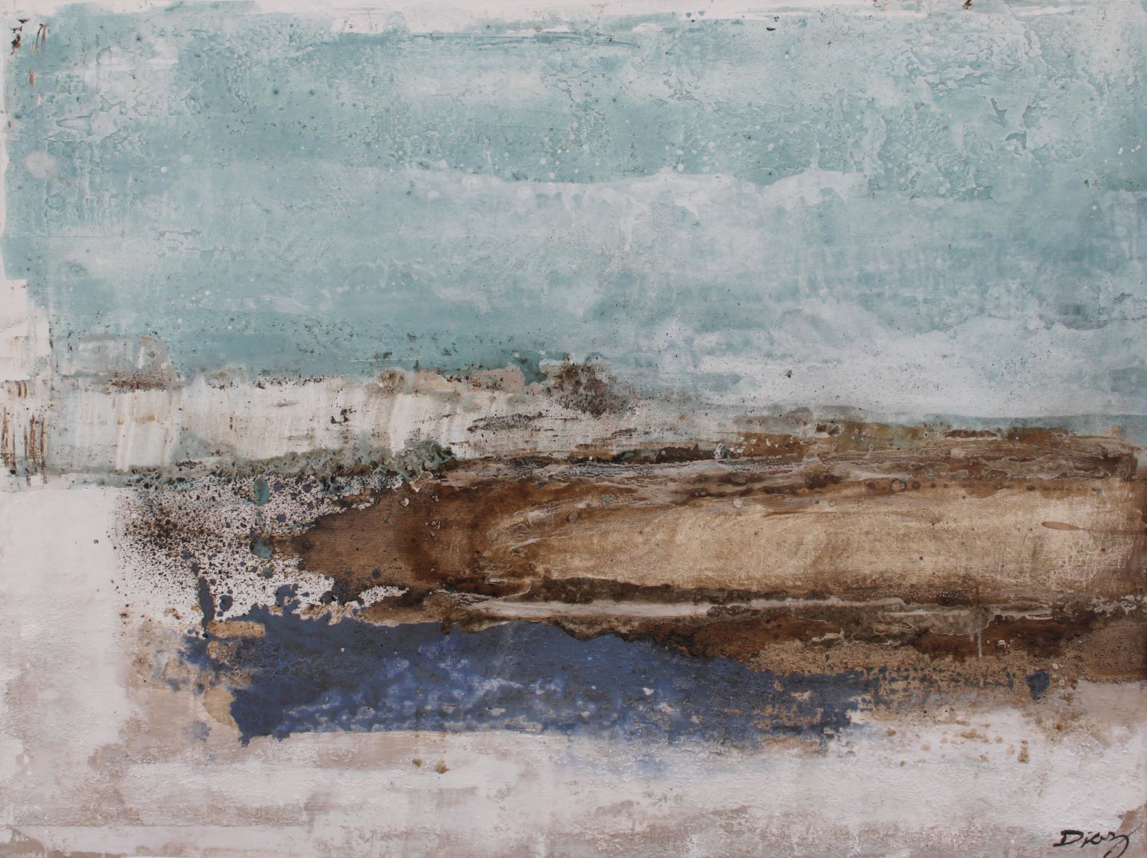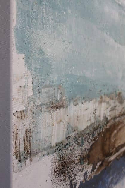 Cuadro original pintado a mano en acrílico sobre lienzo, con textura combinada con masillas plásticas. Colores blancos combinados con diferentes tonalidades de marrones, con ese toque de luz que le aporta el color azul turquesa, recordando a la Isla de Menorca
