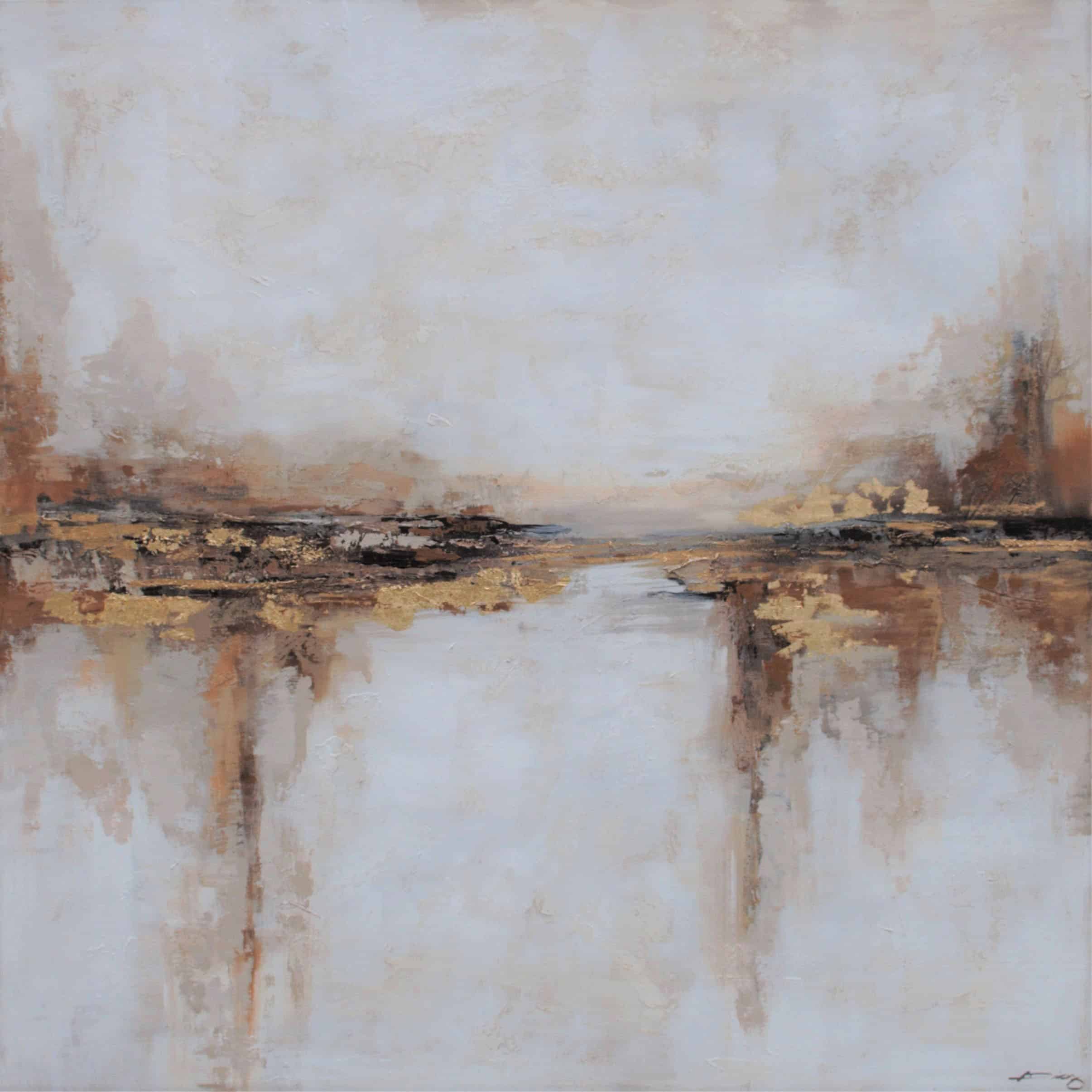 Cuadro pintado a mano en acrílico sobre lienzo. Totalmente acabado y montado, listo para colgar en su pared, con texturas. Tonalidades Marrones en gamas, Franja central con detalles en pan de oro. Fondo beige
