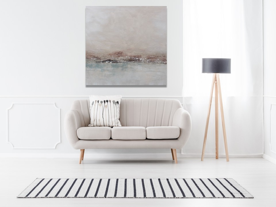 Cuadro original pintado a mano en acrílico sobre lienzo, con texturas. Colores beiges, rosas muy suaves, y grises verdosos, con un ligero salpicado en blanco muy sutil