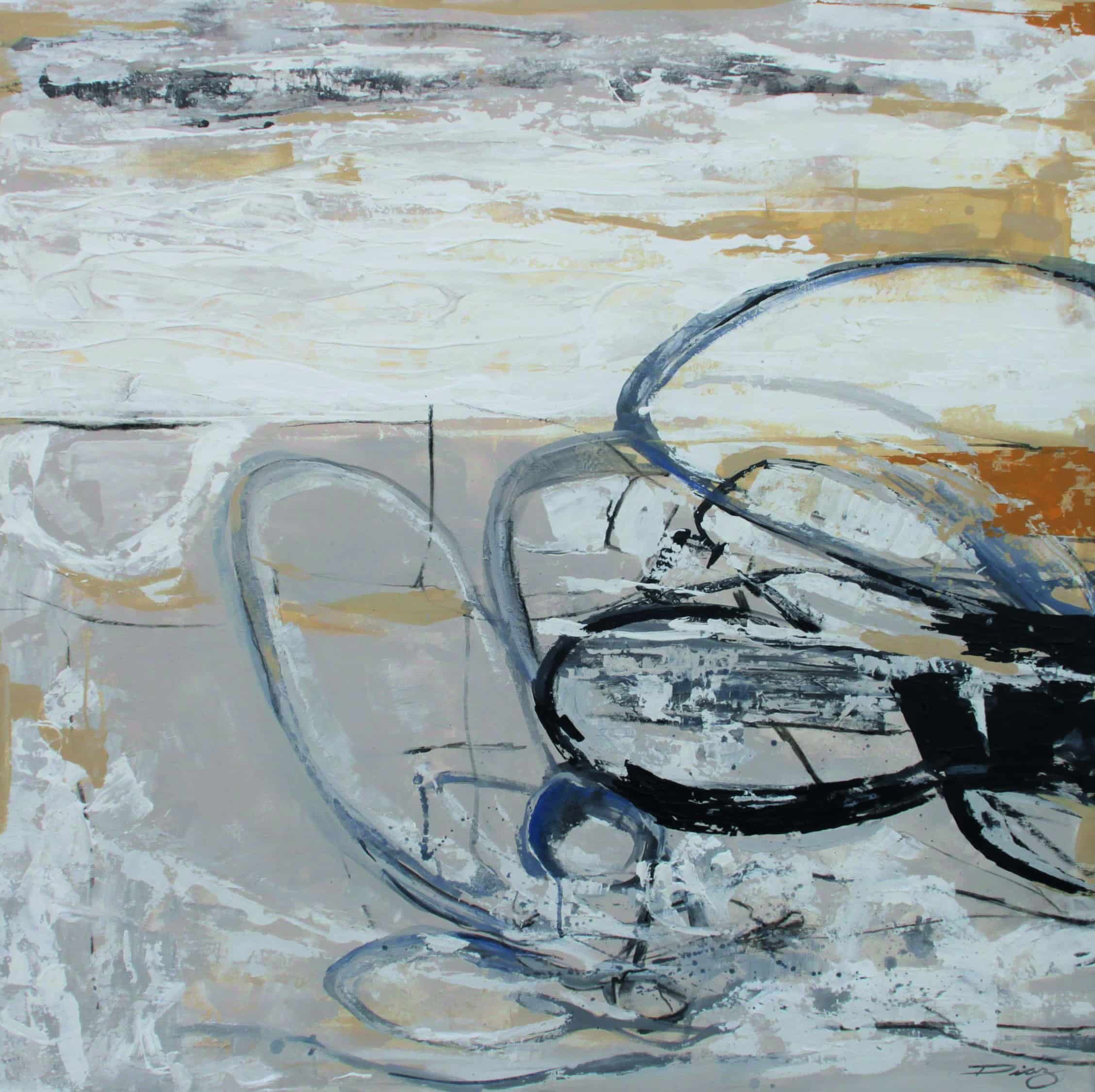 Cuadro original pintado a mano en acrílico sobre lienzo, con ligeras texturas. Fondo arena, blanco roto y gris , con un toque de ocre y pinceladas negras. Obra con gran personalidad y carácter