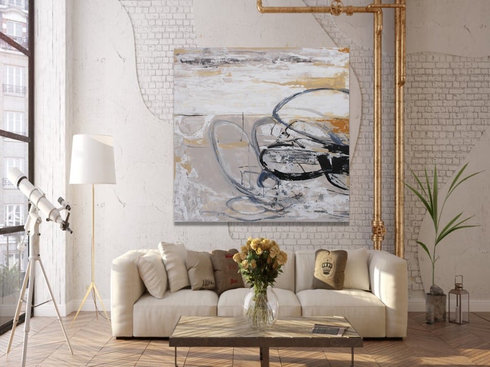 Cuadro pintado a mano en acrílico sobre lienzo. Totalmente acabado y montado, listo para colgar en su pared, con ligeras texturas. Fondo arena, blanco roto y gris , con un toque de ocre y pinceladas negras. Obra con gran personalidad y carácter
