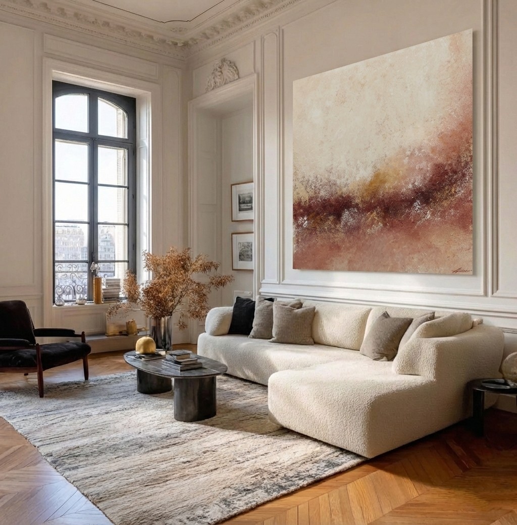 Cuadro pintado a mano en acrílico sobre lienzo. Totalmente acabado y montado, listo para colgar en su pared, con mucha textura arenosa combinada con masillas plásticas. Predominan los colores beiges ,marrones, tejas ligeros toques de ocres, difuminándose entre ellos. Acabado mate sin brillo