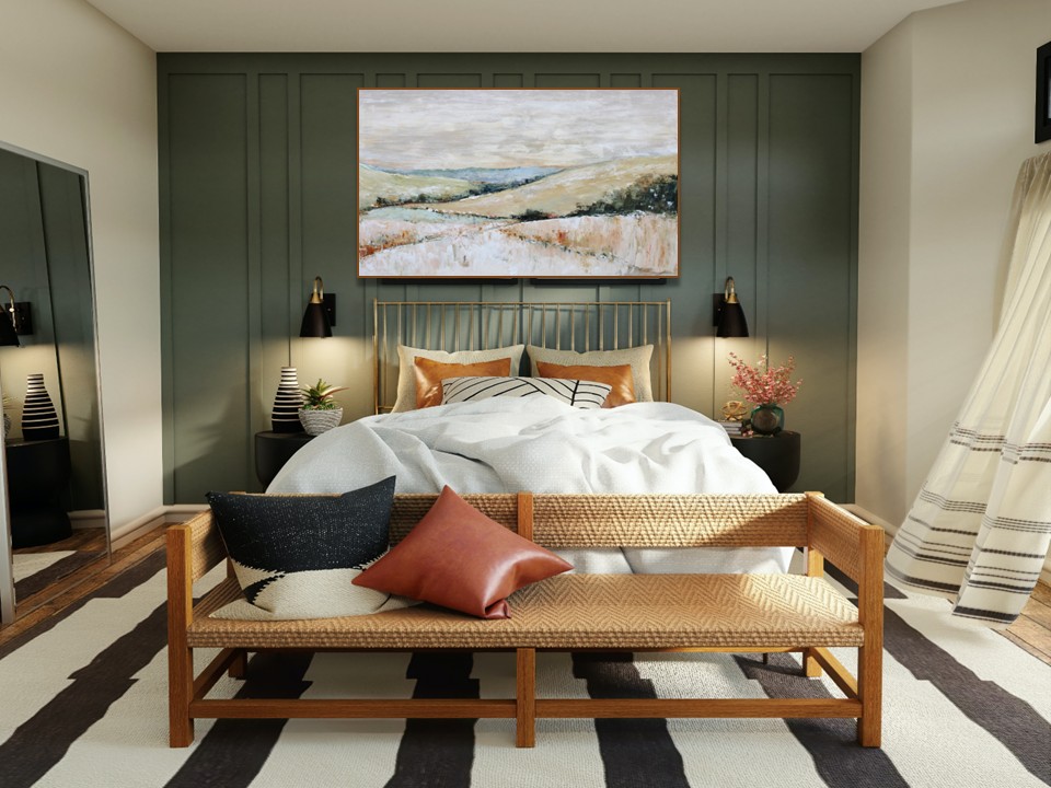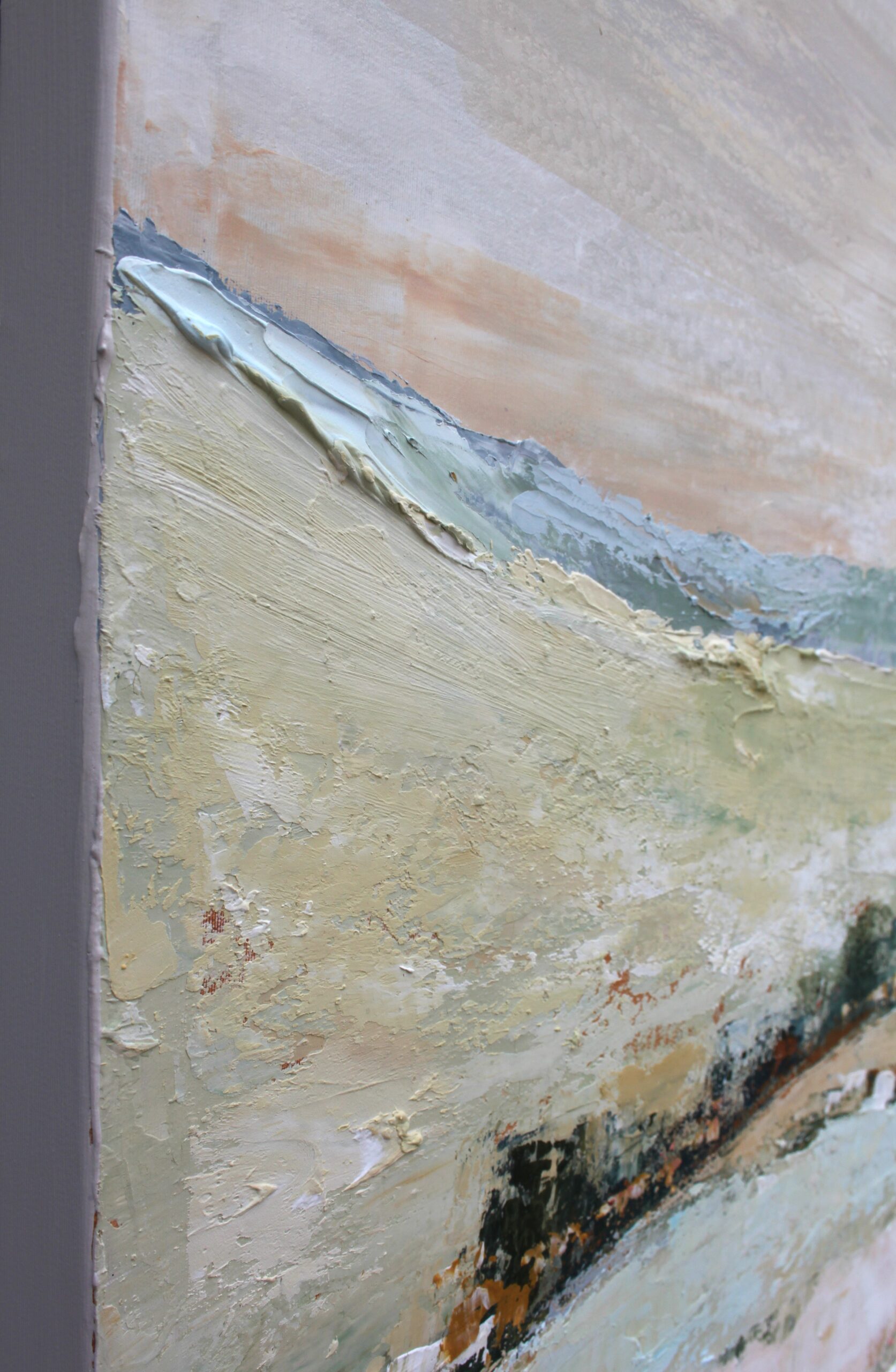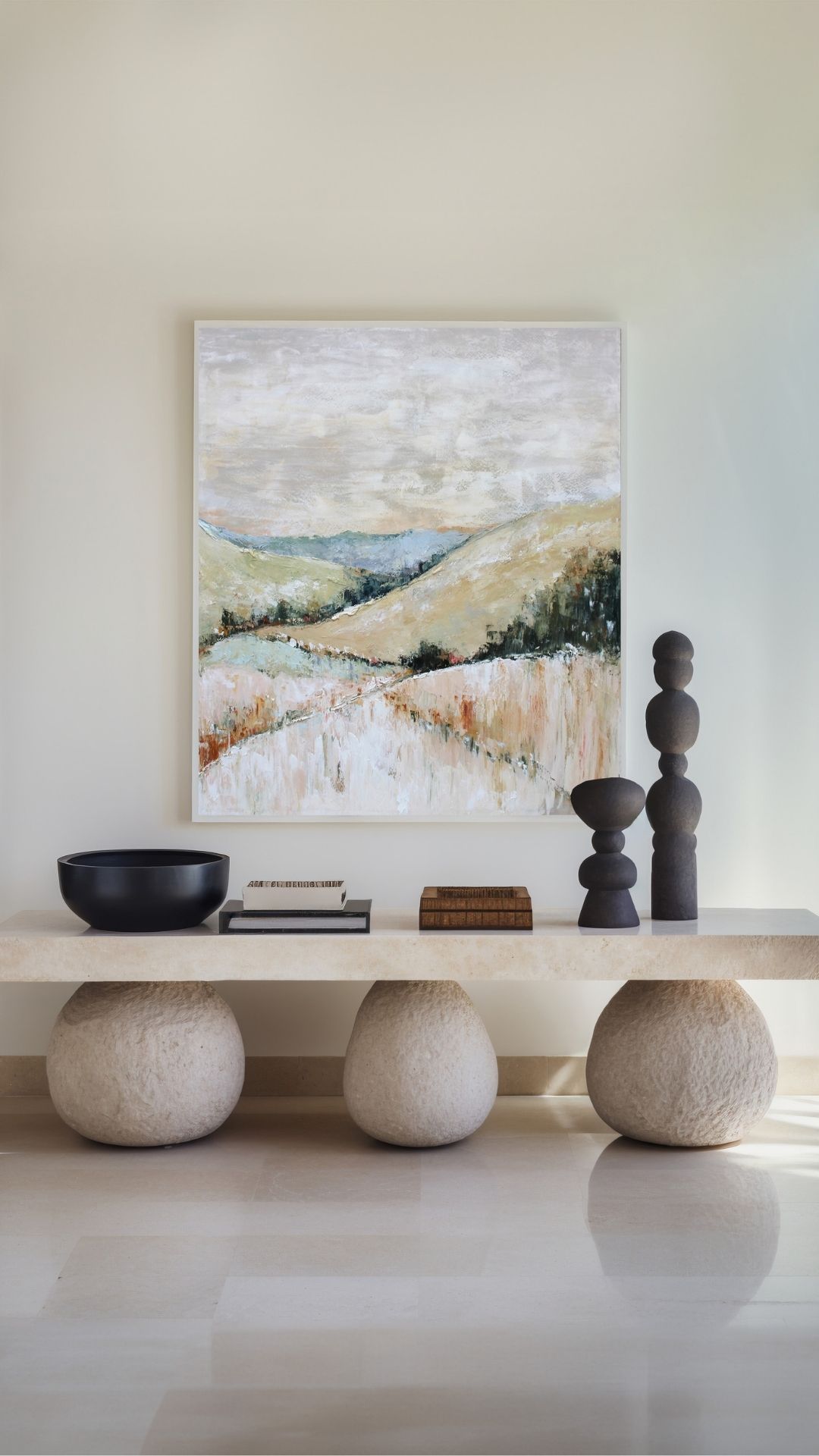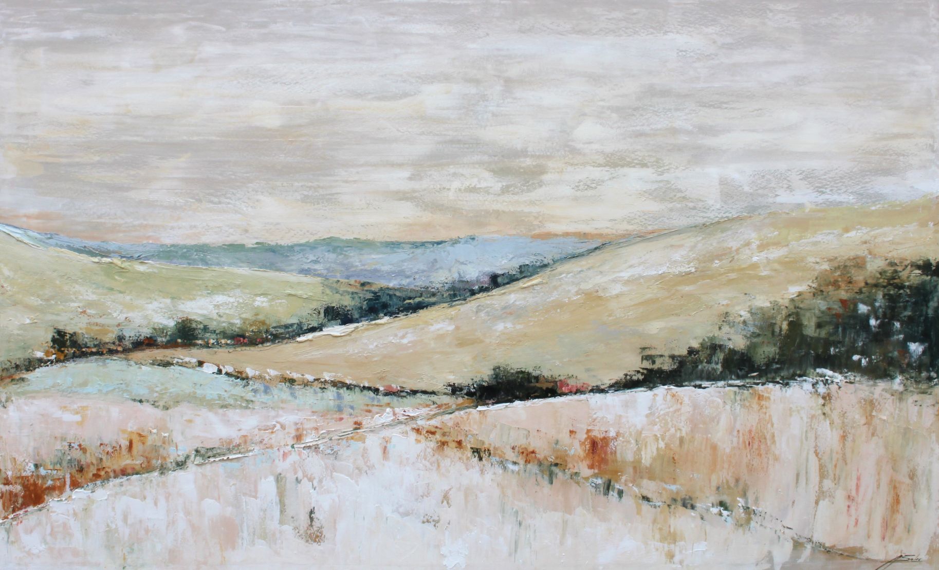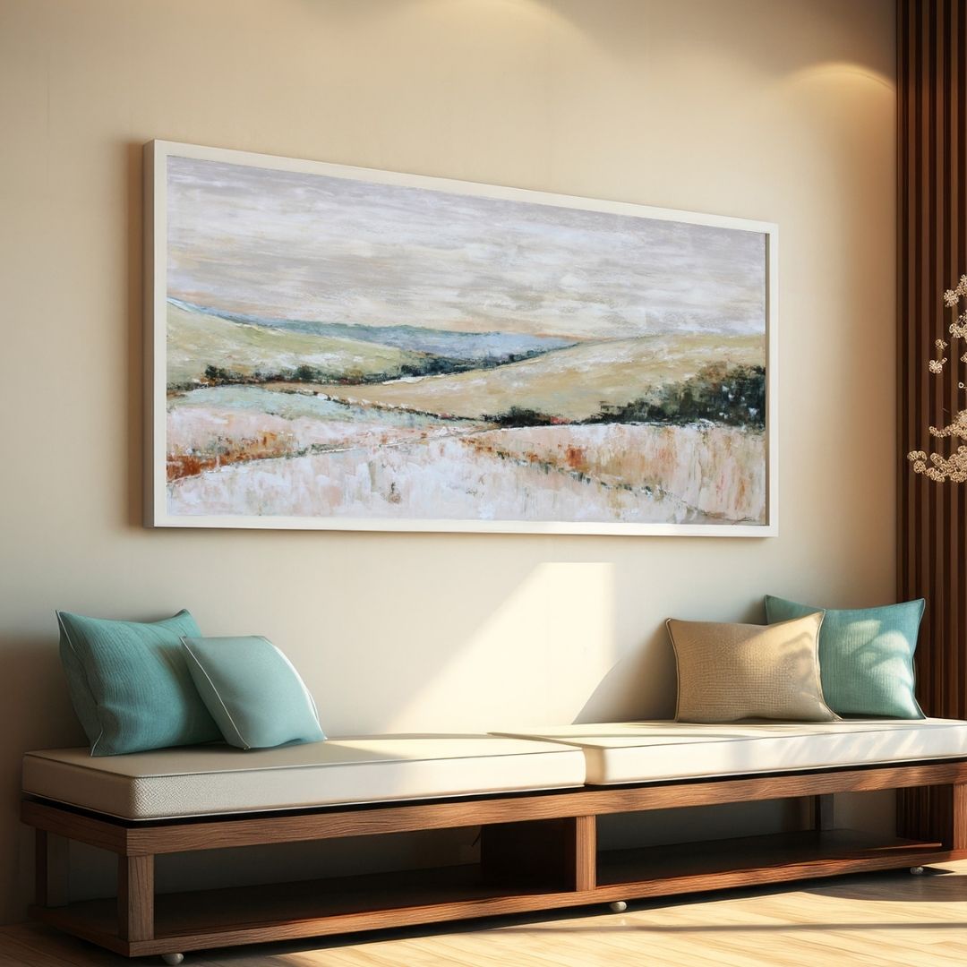 Este cuadro abstracto pintado a mano evoca un paisaje sereno y abierto, donde los tonos tierra, ocres y verdes suaves se funden con matices azulados en el horizonte. Las pinceladas amplias y texturizadas sugieren colinas y campos bañados por una luz tenue, creando una atmósfera que transmite calma y amplitud. Con un estilo entre lo real y lo propuesto, la obra invita a contemplar la belleza de la naturaleza desde una mirada poética y emocional. Embellecedor de madera no incluido