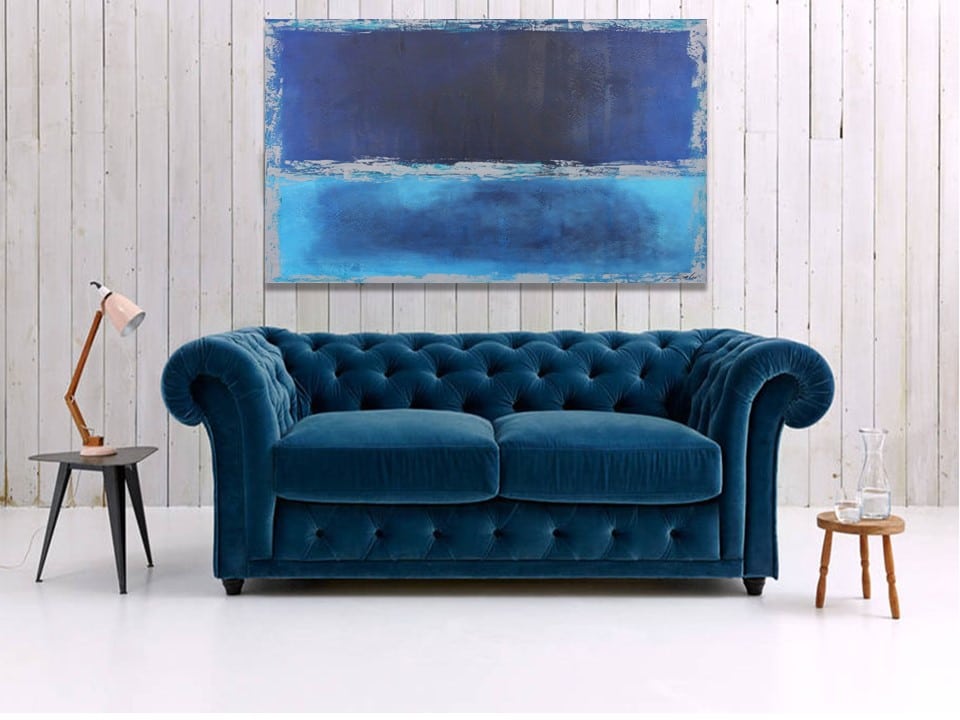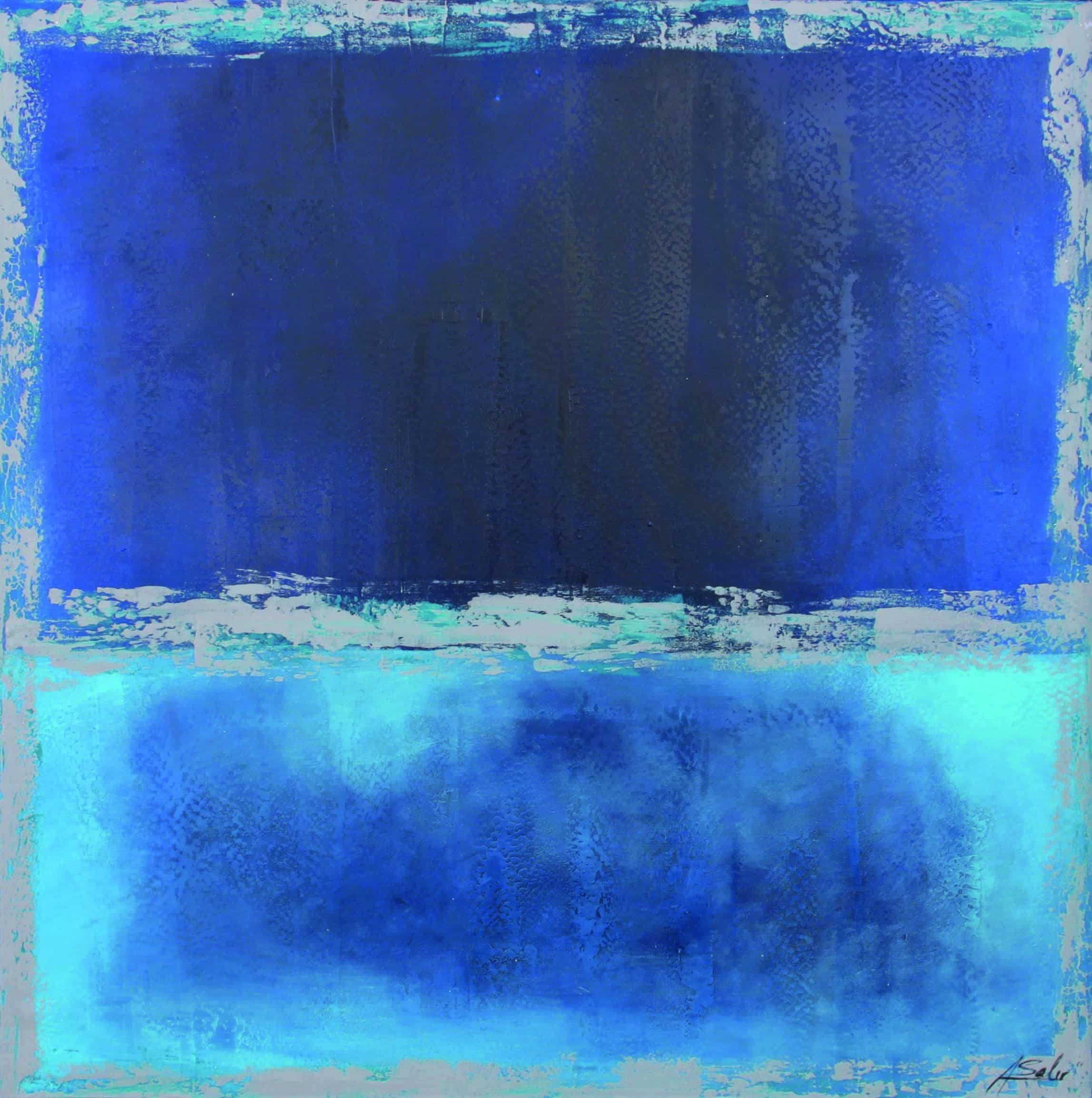Cuadro pintado a mano en acrílico sobre lienzo. Totalmente acabado y montado, listo para colgar en su pared, con texturas. Colores azules se mezclan entre sí, con los cantos en grises. Obra espectacular inspirada entre mar y el cielo del País Escandinavo