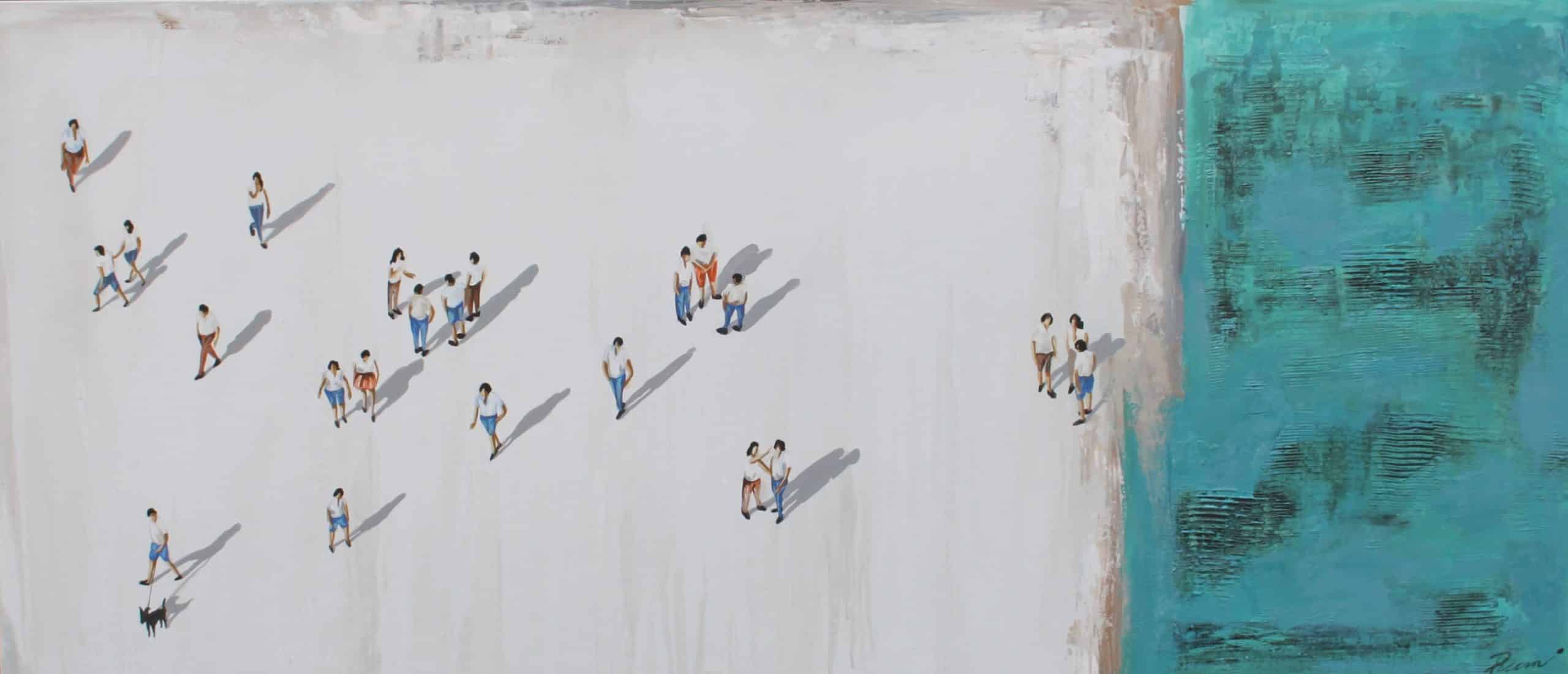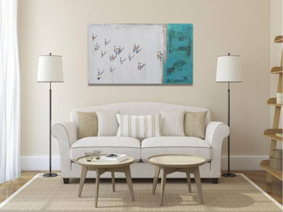 Cuadro original pintado sobre lienzo por artistas de Bellas Artes. Personajes de gran realismo en Fondo Beige Arena y lateral Turquesa con ligeras texturas aplicadas con espátula