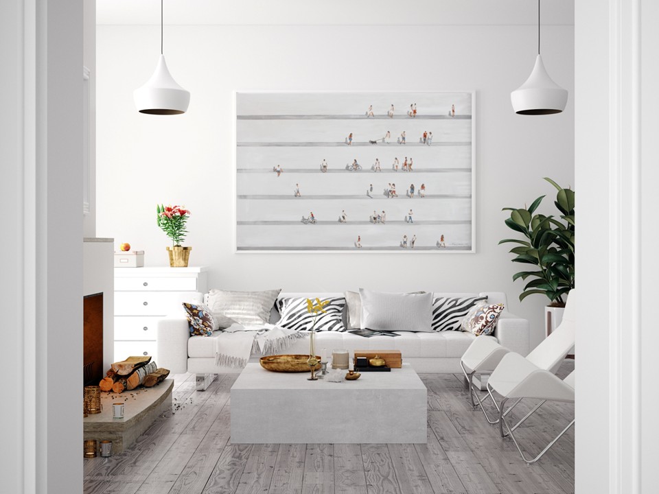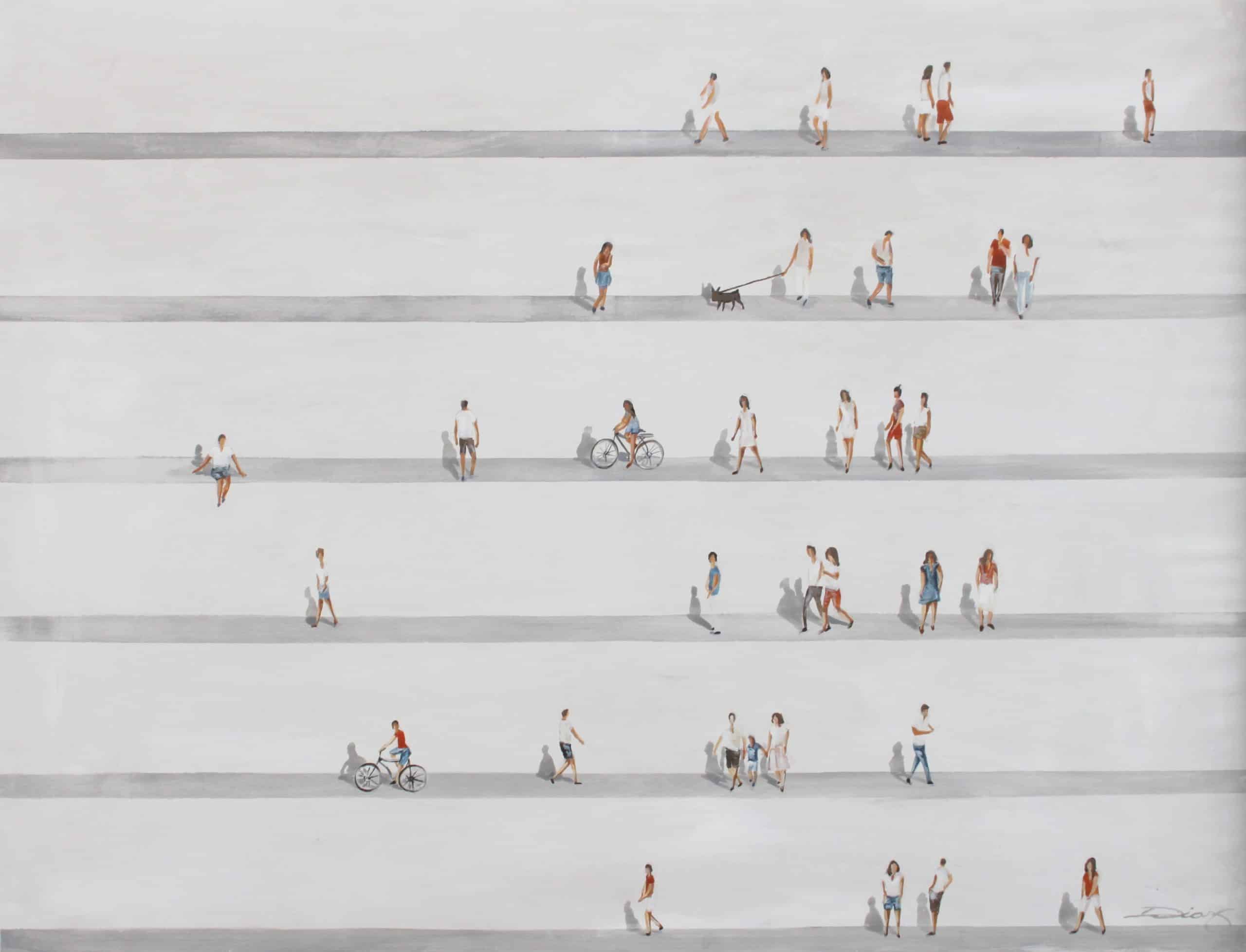 Cuadro original pintado a mano sobre lienzo por artistas de Bellas Artes. Lienzo y pinturas de gran calidad. Fondos en blanco roto, con las rayas transversales en gris. Colores pastel con personajes figurativos que parecen en movimiento. Gran calidad Artística. Marco Blanco embellecedor no incluido