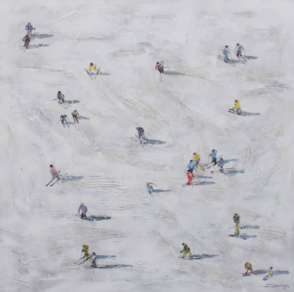 Cuadro original pintado sobre lienzo por artistas de Bellas Artes. Lienzo y pinturas de gran calidad. Fondos en beige, colores pastel con personajes esquiando que parecen en movimiento. Gran calidad Artística