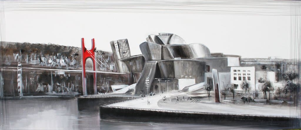 Cuadro original pintado a mano del Museo Guggenheim de Bilbao, sobre lienzo de tela. Acabado por los laterales y listo para colgar.