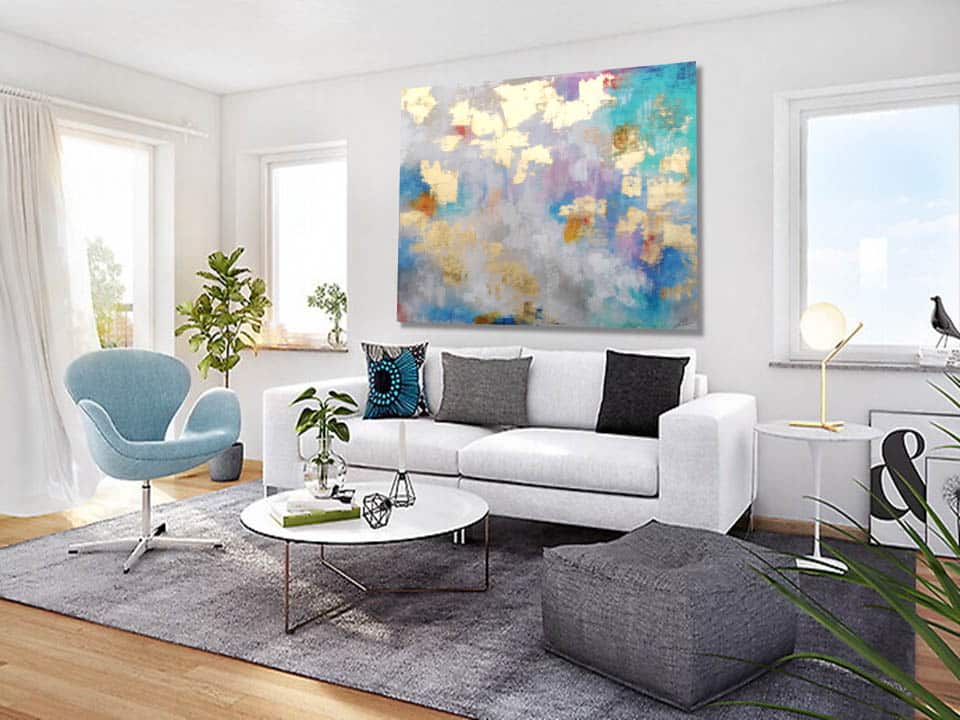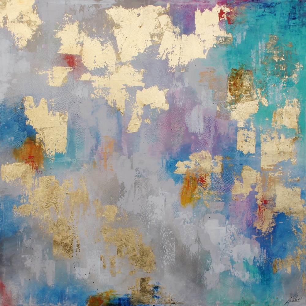 Cuadro original pintado a mano en acrílico sobre lienzo con texturas. Los colores verdes, azules, magenta, se mezclan con el pan de oro consiguiendo una armonía de colores en tonos pastel.