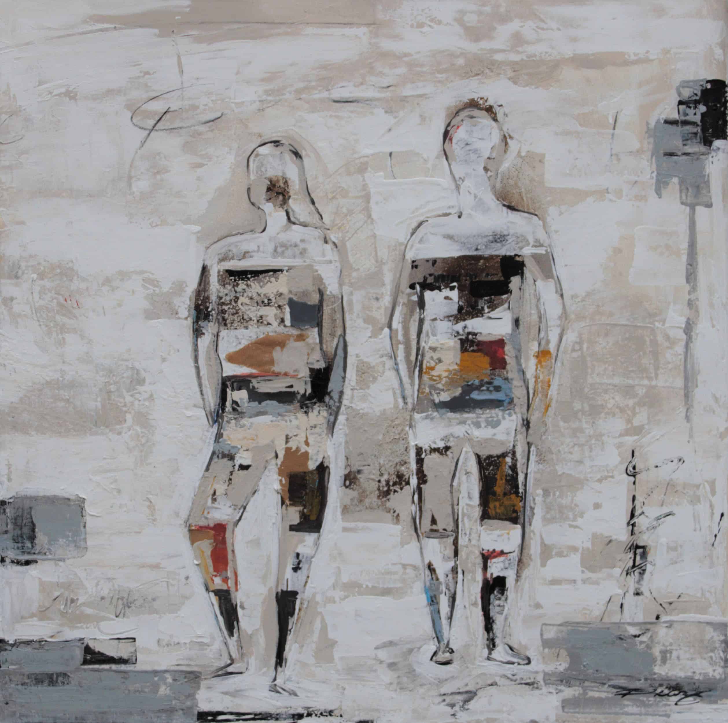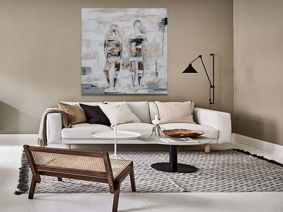 Cuadro original pintado a mano en acrílico sobre lienzo, con texturas. Fondo blanco roto, arena y gris , con un toque de marrones y pinceladas color teja y turquesas. Obra hecha con técnica collage y mucha textura con personalidad y carácter
