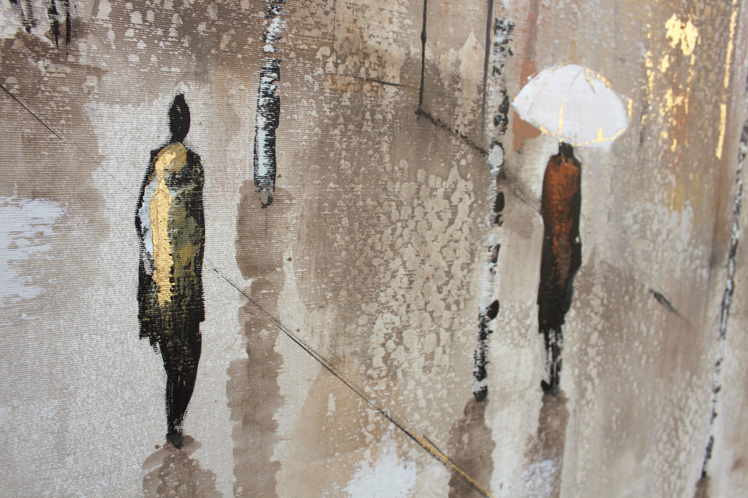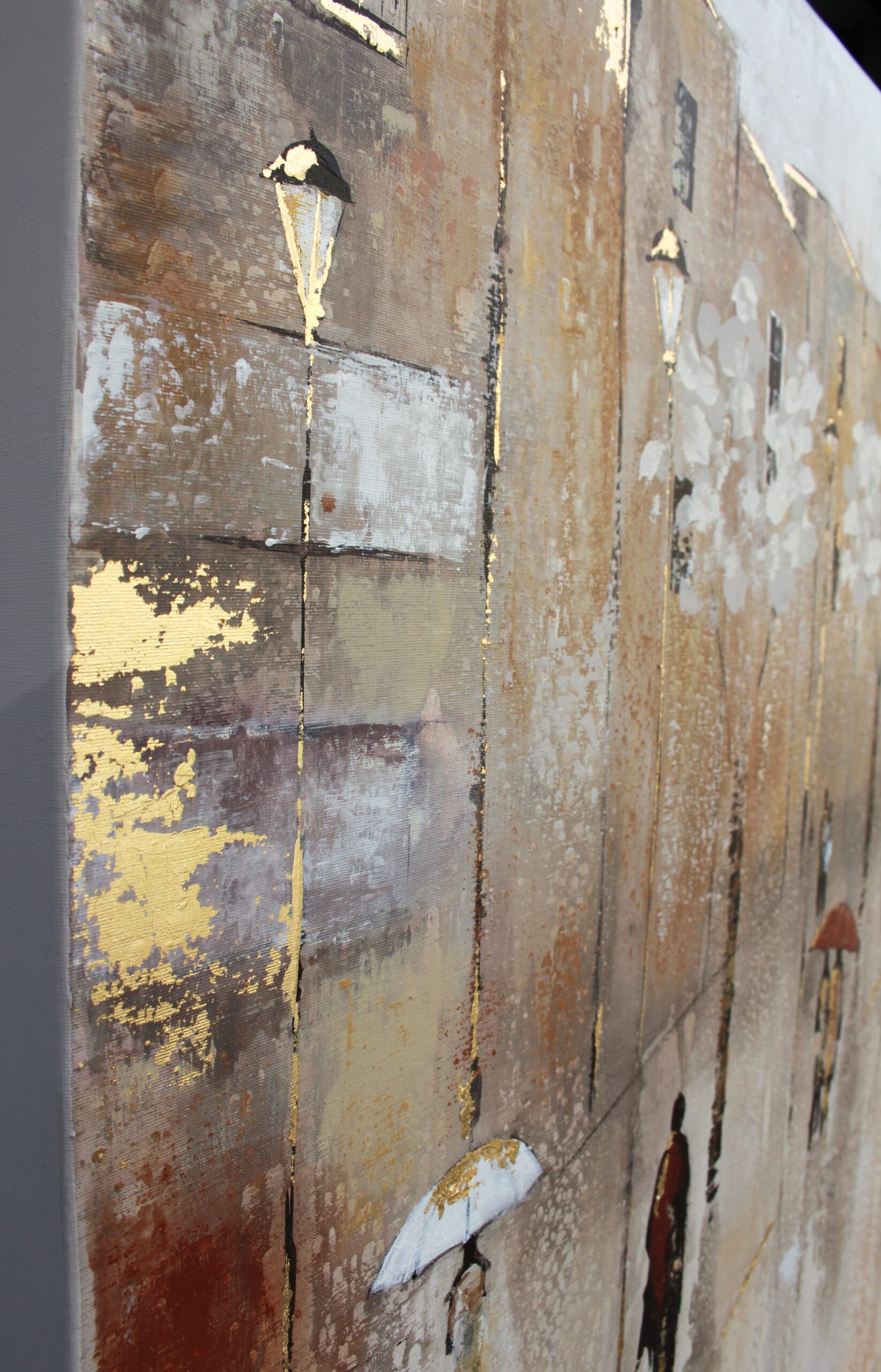 La atmósfera es la protagonista indiscutible de esta obra. Las nubes grises cubren el cielo, dejando caer una lluvia fina que se refleja en el pavimento húmedo. Los charcos se convierten en pequeños espejos que reflejan la luz tenue de las farolas y los edificios circundantes. La humedad del ambiente se siente casi palpable, creando una sensación de calma y melancolía. Las pinceladas de esta obra son sueltas y sugerentes, creando una sensación de movimiento y atmósfera. Los contornos son difuminados, lo que aporta una sensación de profundidad y realismo. Toques de pan de oro sobre fondos marrones, grises y blancos. Los edificios, con sus fachadas de piedra y estuco, se elevan a ambos lados de la calle, creando una sensación de profundidad y perspectiva.
