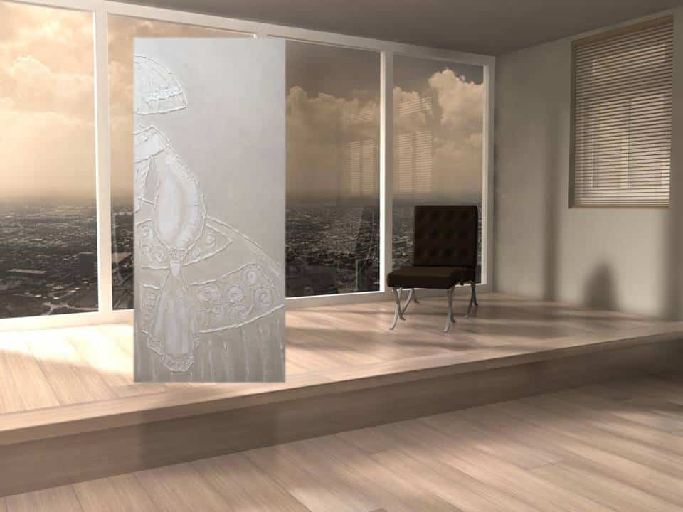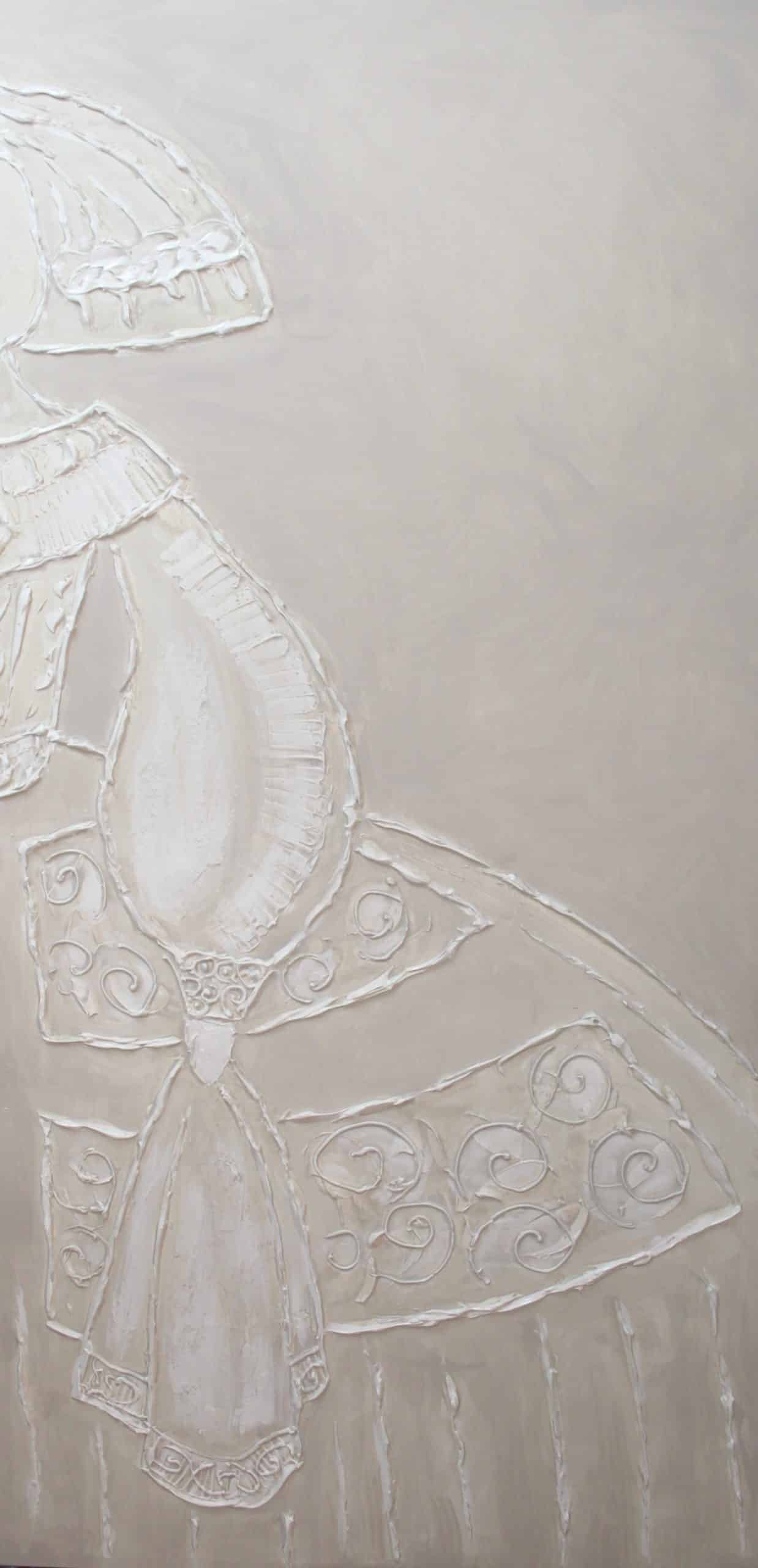 Cuadro pintado a mano de una menina en relieve sobre fondo beige claro. El diseño vertical incorpora patrones ornamentales y espirales en textura, logrando un efecto minimalista y elegante. Ideal para interiores modernos, escaleras o zonas de paso con altura. Obra muy elegante