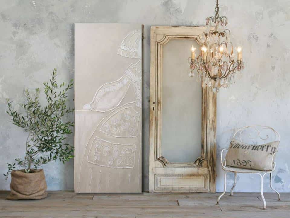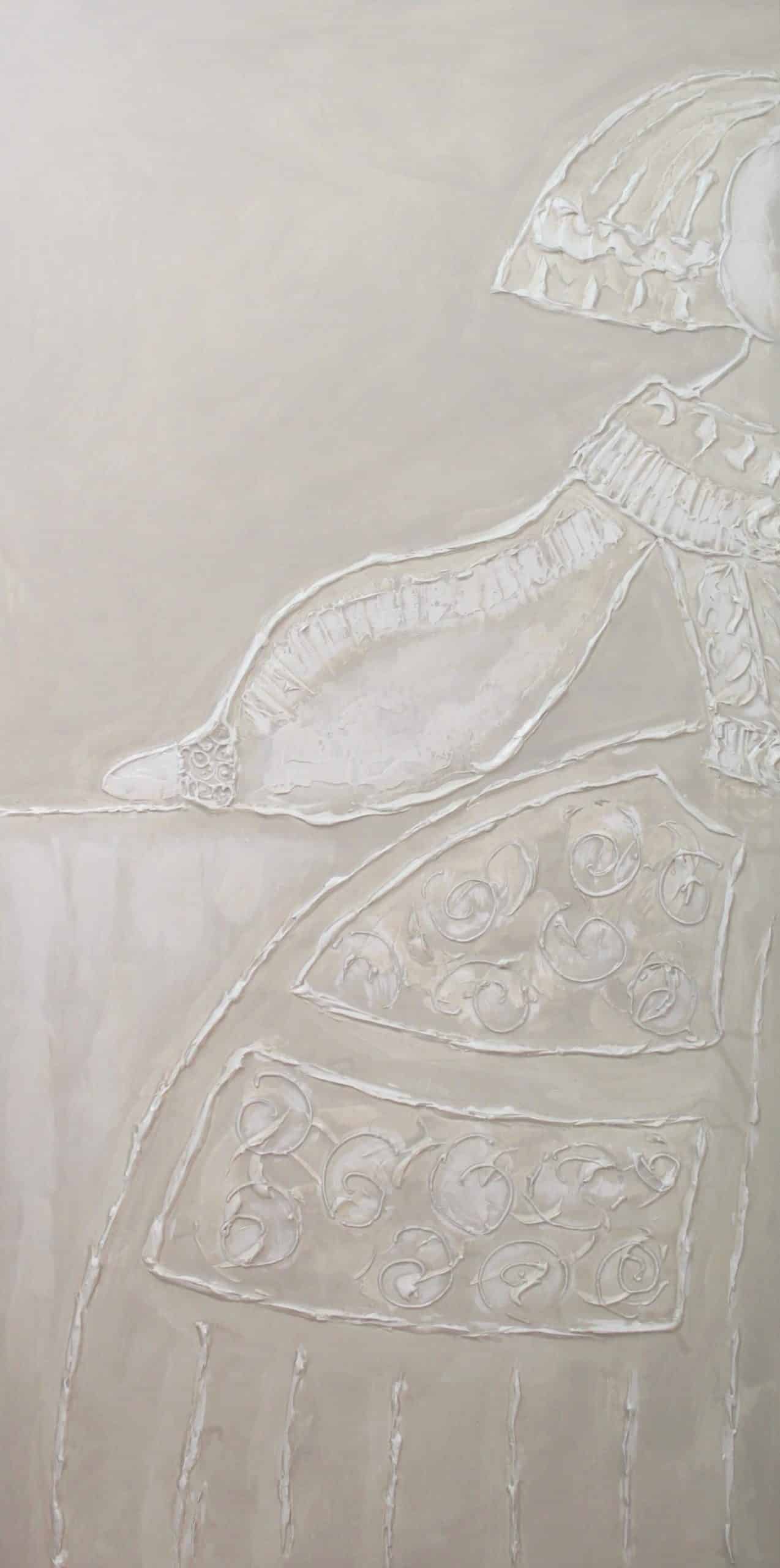 Cuadro pintado a mano de una menina en relieve sobre fondo beige claro. El diseño vertical incorpora patrones ornamentales y espirales en textura, logrando un efecto minimalista y elegante. Ideal para interiores modernos, escaleras o zonas de paso con altura. La textura de relieve con pasta artistica le aporta categoria