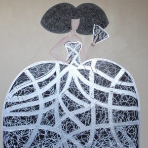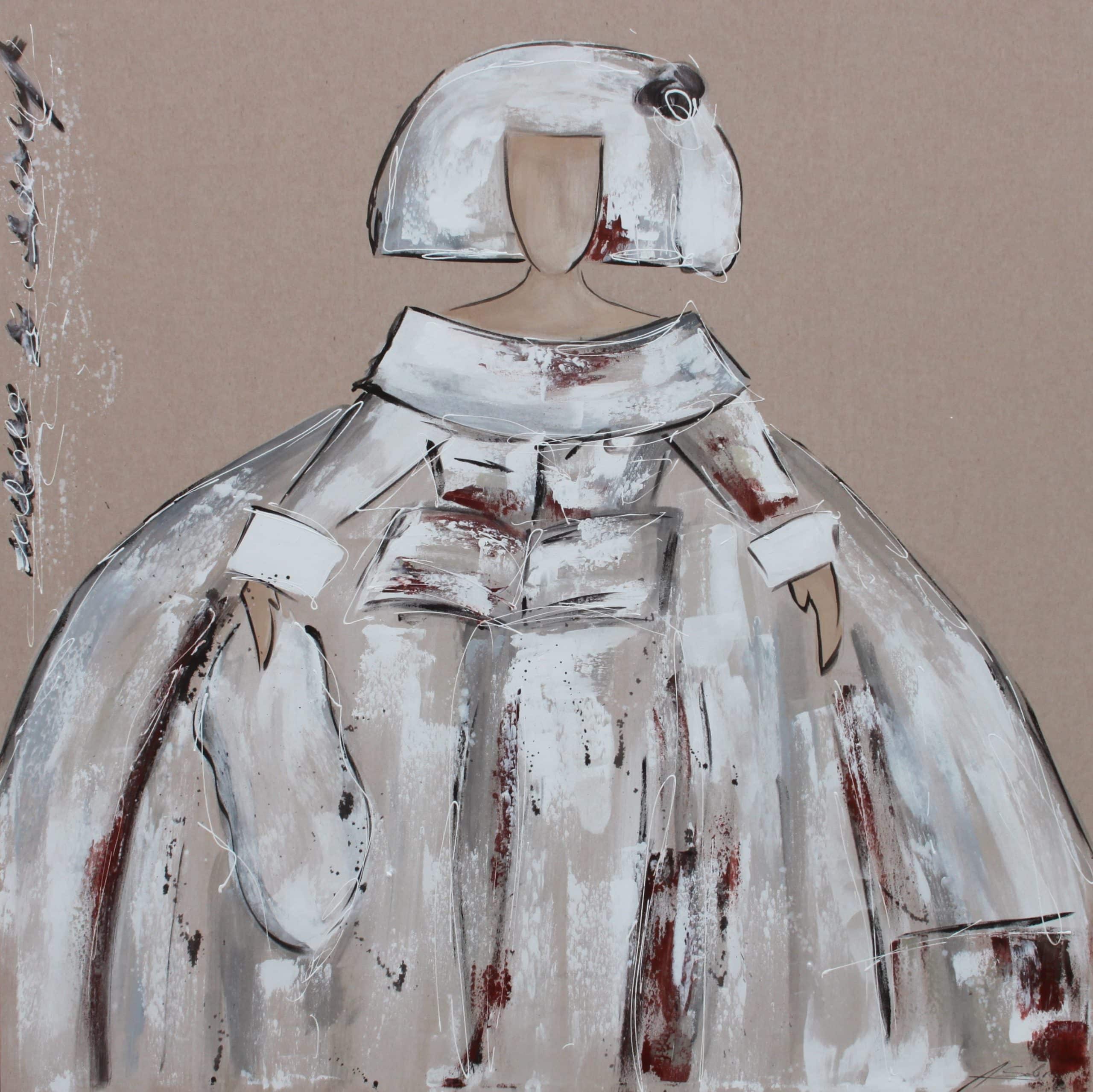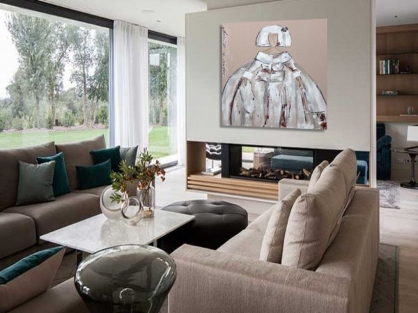 Cuadro pintado a mano que representa una menina en estilo moderno, con vestido blanco texturizado, detalles en marrón y fondo beige kraft. Su trazo suelto y minimalismo facial le confieren una estética contemporánea perfecta para espacios elegantes y creativos. Pintada sobre tela de saco