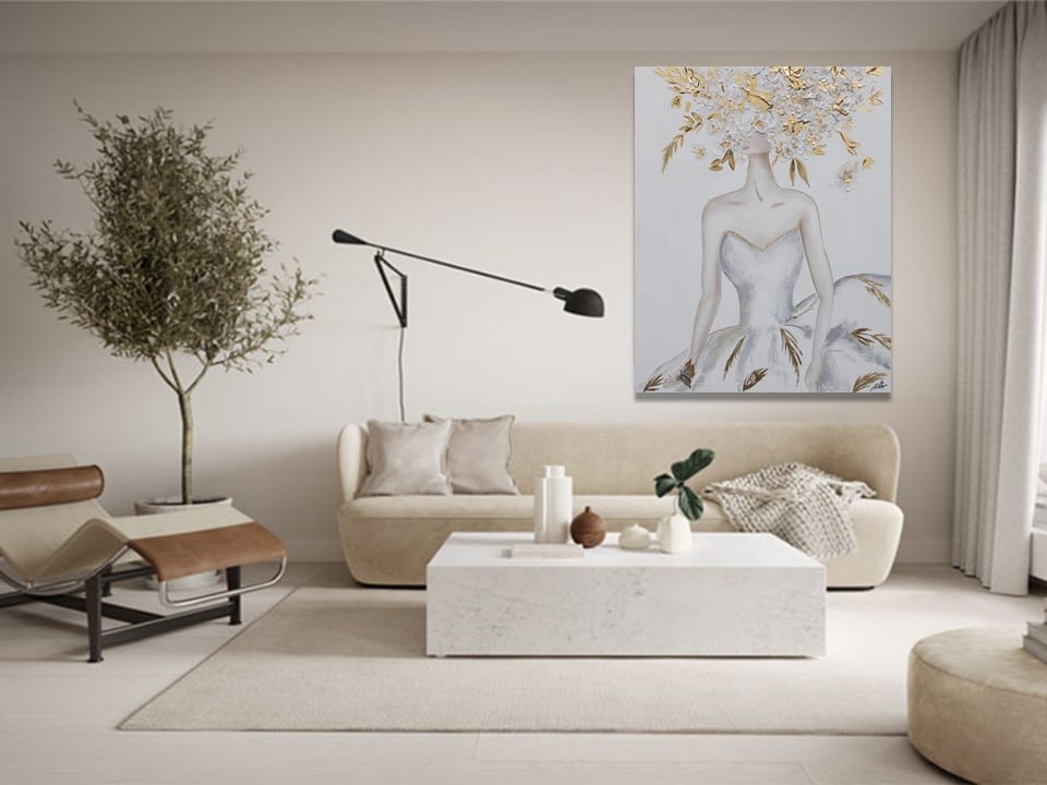 Cuadro pintado a mano que representa a una mujer de espaldas con una explosión floral en blanco y hojas doradas que emergen de su cabeza como una corona natural. La obra combina feminidad, sofisticación y estilo contemporáneo. Ideal para decoración elegante y ambientes serenos, con pan de oro pintada.