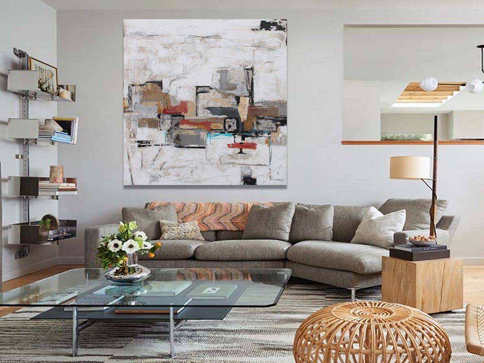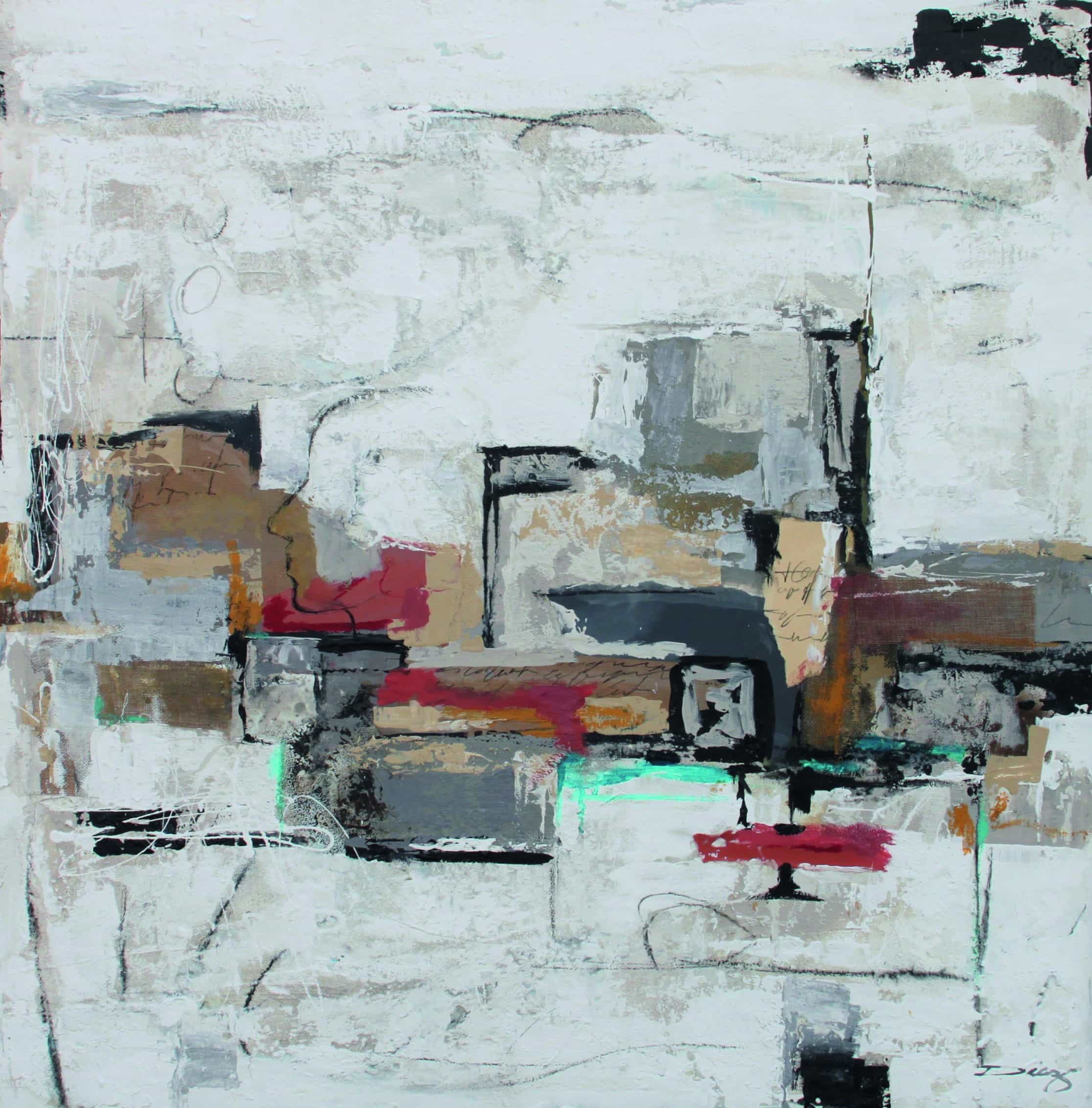 Cuadro original pintado a mano  en acrílico sobre lienzo, con texturas. Fondo blanco roto, arena y gris , con un toque de marrones y pinceladas color teja y turquesas. Obra hecha con técnica collage con textura, personalidad y carácter