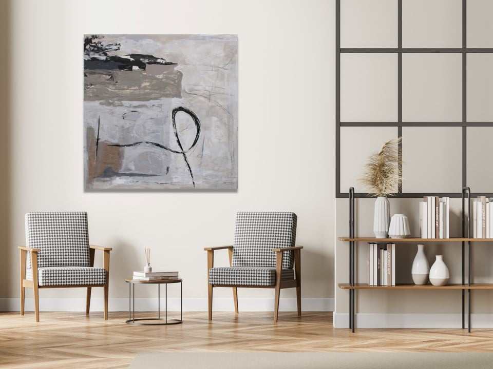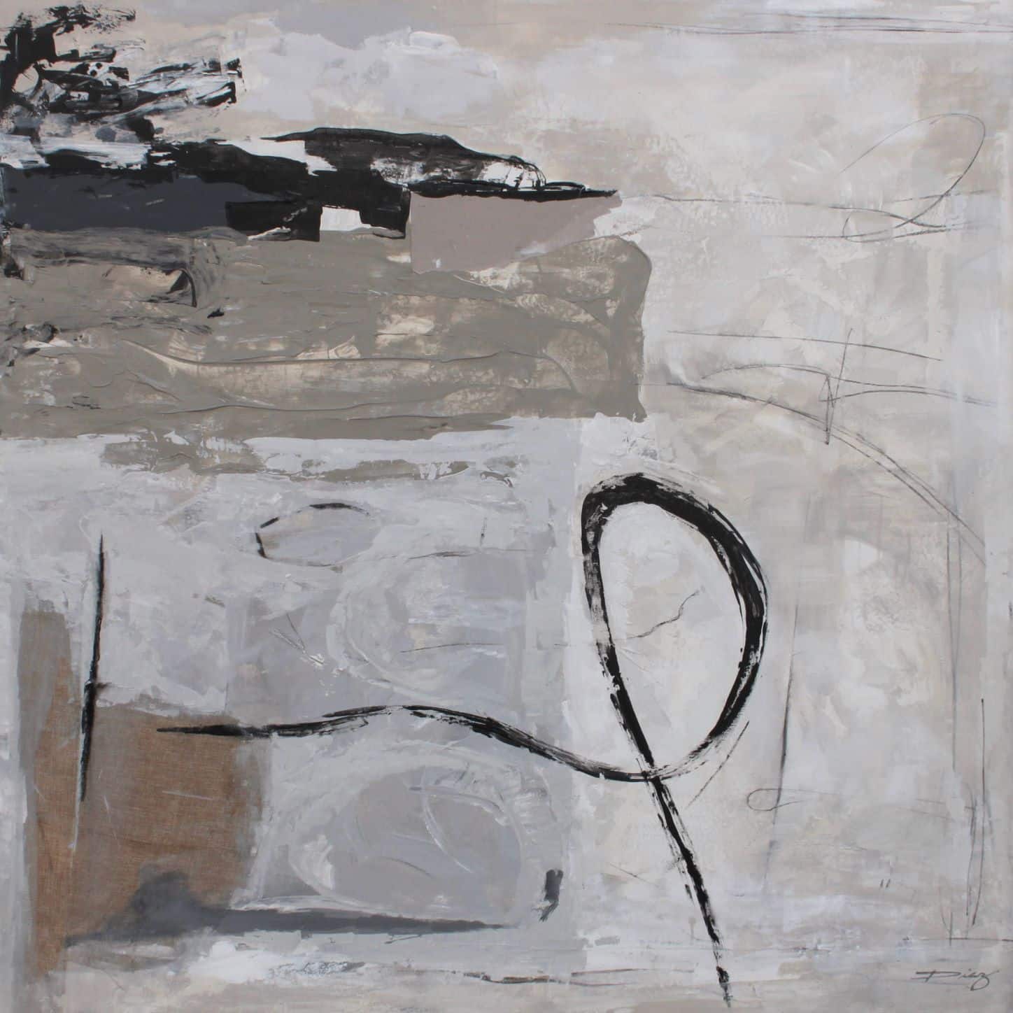 Cuadro original pintado a mano en acrílico sobre lienzo, con ligeras texturas. Fondo blanco roto y gris , combinando con colores topo y pinceladas negras. Obra con gran personalidad y carácter