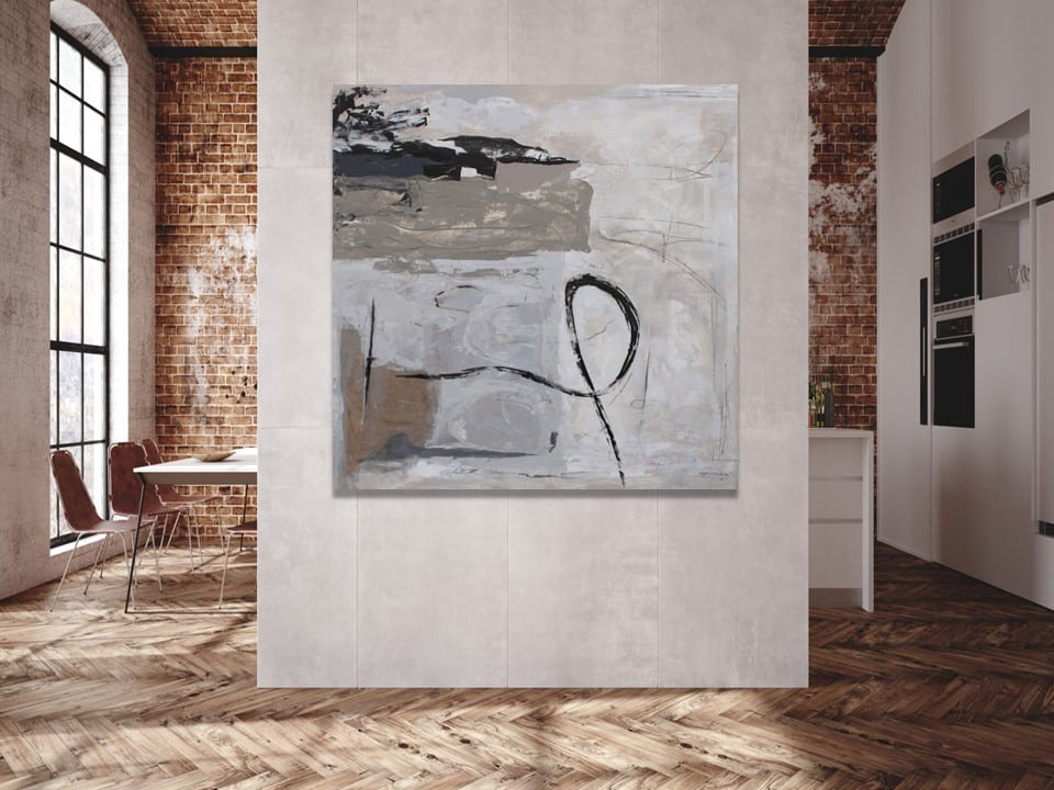 Cuadro pintado a mano en acrílico sobre lienzo. Totalmente acabado y montado, listo para colgar en su pared, con ligeras texturas. Fondo blanco roto y gris , combinando con colores topo y pinceladas negras. Obra con gran personalidad y carácter