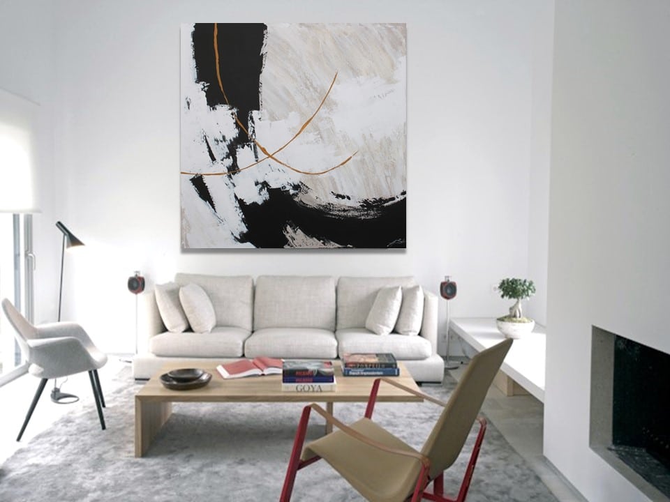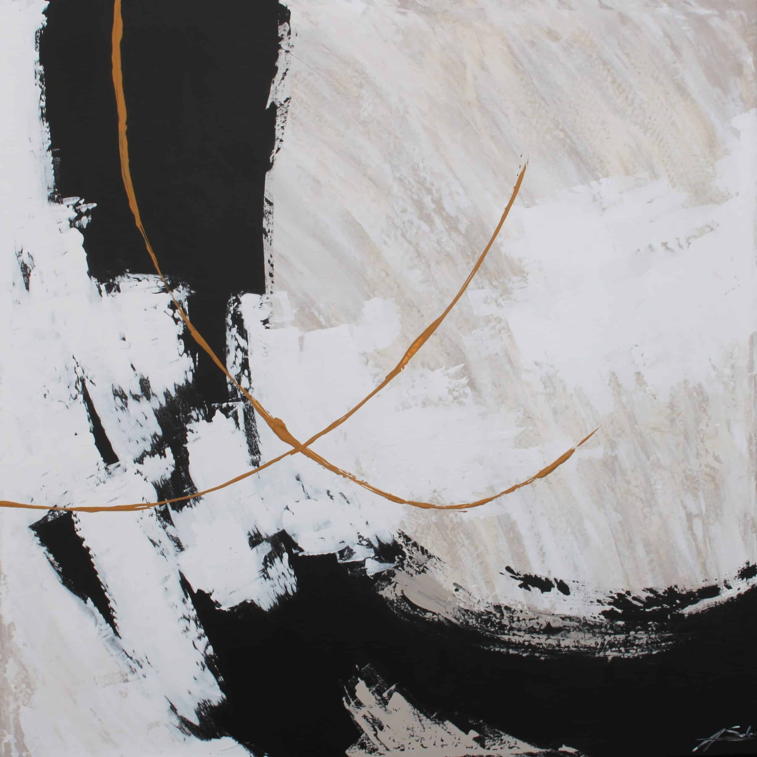 Cuadro original pintado a mano en acrílico sobre lienzo, con texturas. Tonalidades Grises se mezclan entre sí, con colores topo y un gran trazo negro, dándole carácter sobre fondo blanco. Toque final en ocre…
