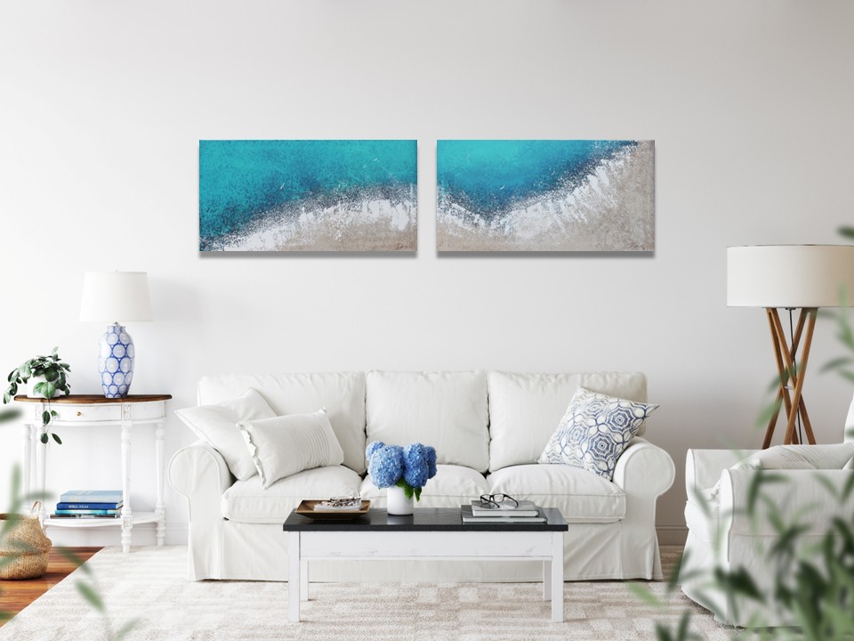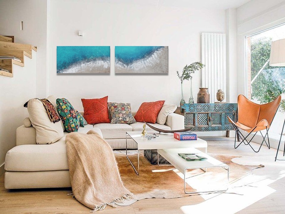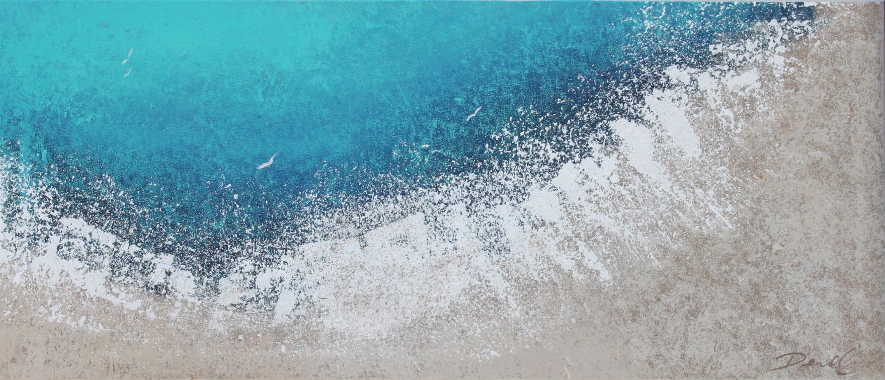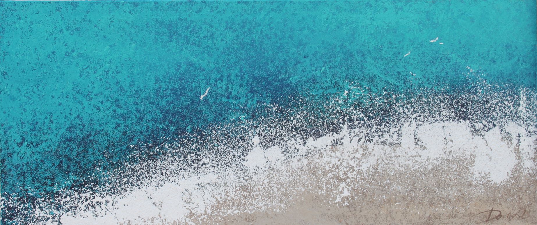 Con una paleta que evoca el brillo del sol en el agua y la suavidad de la arena, «SA CONCA» destaca por su impresionante mar turquesa intenso, contrastando magistralmente con las texturas ricas y empastadas que simulan la espuma de las olas rompiendo suavemente en la orilla. La aplicación de pintura con volumen crea una experiencia táctil y visual, haciendo que las texturas de la arena y el agua casi puedan sentirse.