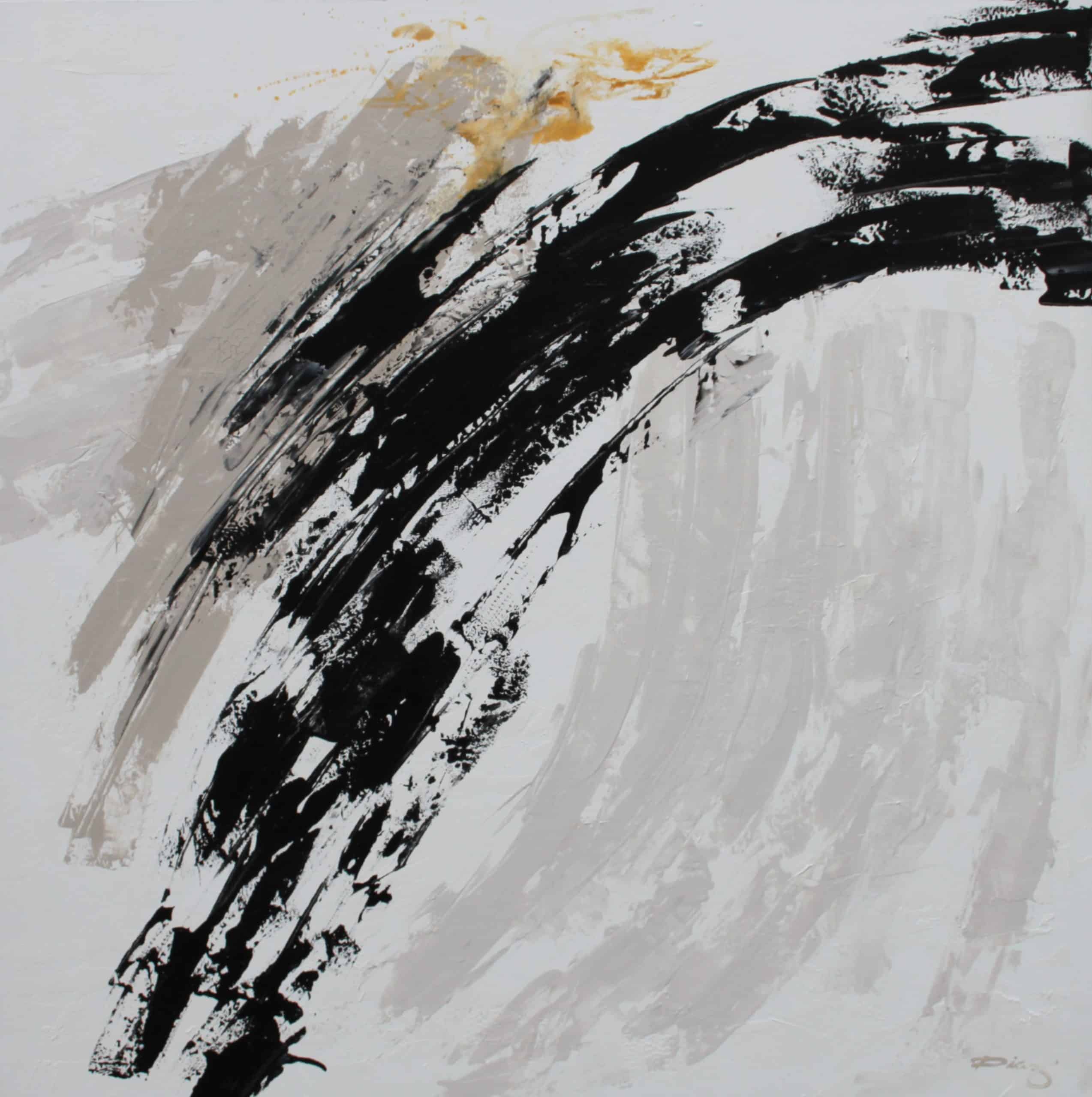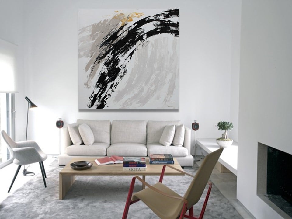 Cuadro pintado a mano en acrílico sobre lienzo. Totalmente acabado y montado, listo para colgar en su pared, con texturas. Tonalidades Grises se mezclan entre sí, con colores topo y un gran trazo negro, dándole carácter sobre fondo blanco