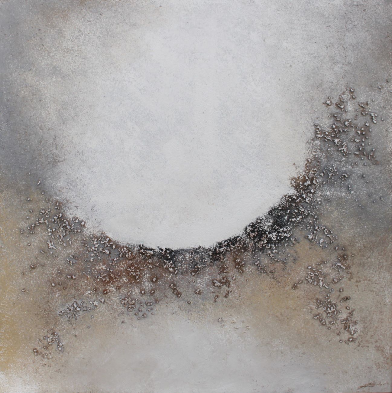 Cuadro pintado a mano en acrílico sobre lienzo, con el fondo en color blanco emulando un cráter lunar, mezclándose con tono arena, beiges y marrones, con texturas arenosas. Totalmente acabado y montado, listo para colgar en su pared.