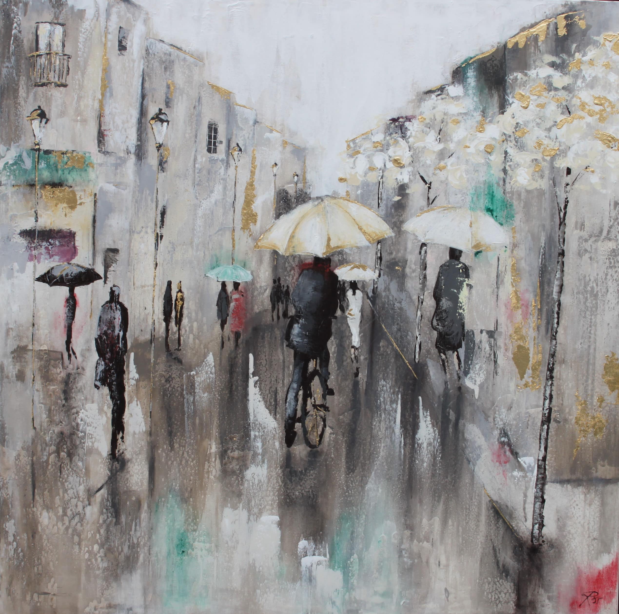 Este cuadro abstracto evoca una escena urbana de la ciudad de Toulouse en Francia, con figuras caminando, a través de una paleta de colores sobria y una atmósfera melancólica, sugerida por la presencia de lluvia o neblina. La obra se caracteriza por su técnica gestual y el uso de texturas que dan vida a la ciudad y sus habitantes. Predominan las tonalidades arenas, grises y beige, con pinceladas de colores. Lleva toques dorados en pan de oro.