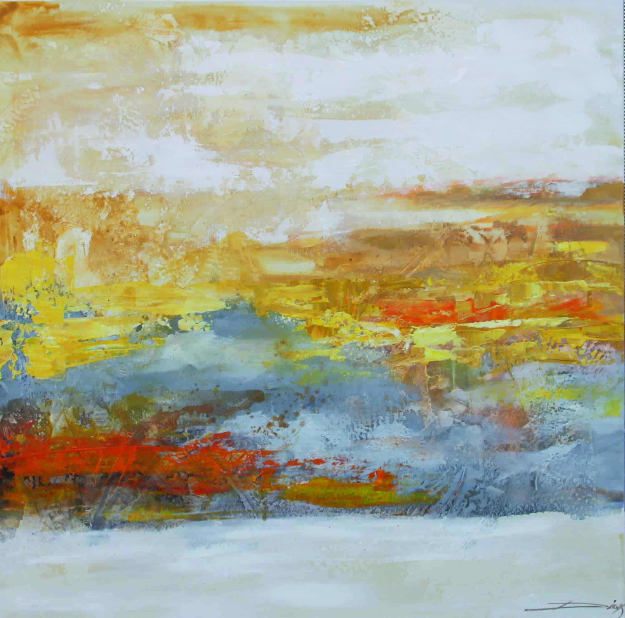 Cuadro original pintado a mano en acrílico sobre lienzo, con texturas. Predominan los colores naranjas, amarillos y grises en tonos pasteles. Obra inspirada en el campo Valenciano