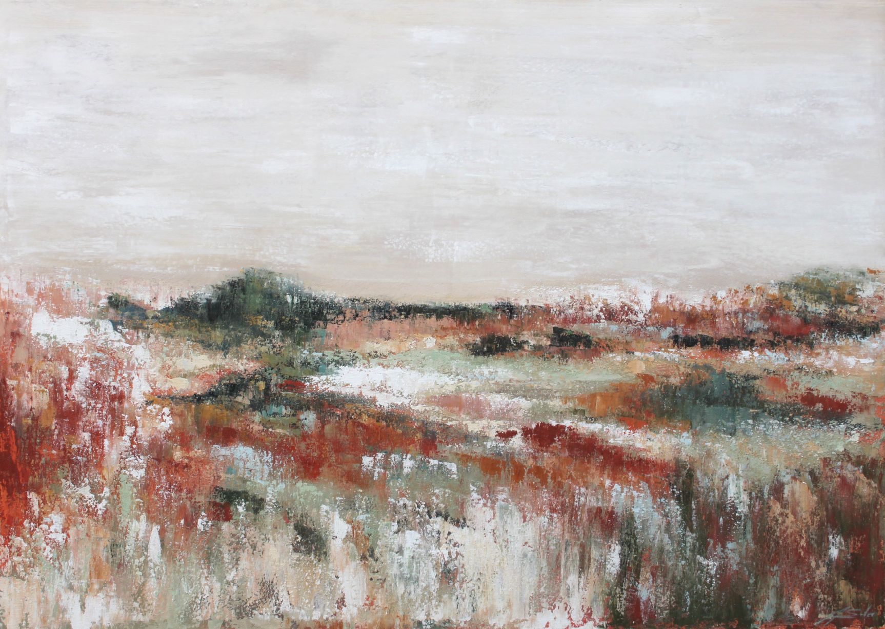 Cuadro abstracto de inspiración paisajística con tonos cálidos y textura vibrante. Sus pinceladas en rojos, ocres y verdes aportan energía, elegancia y un toque contemporáneo, convirtiéndolo en una pieza ideal para realzar salones, oficinas o espacios modernos. Una obra única que llena el ambiente de personalidad, calidez y estilo.