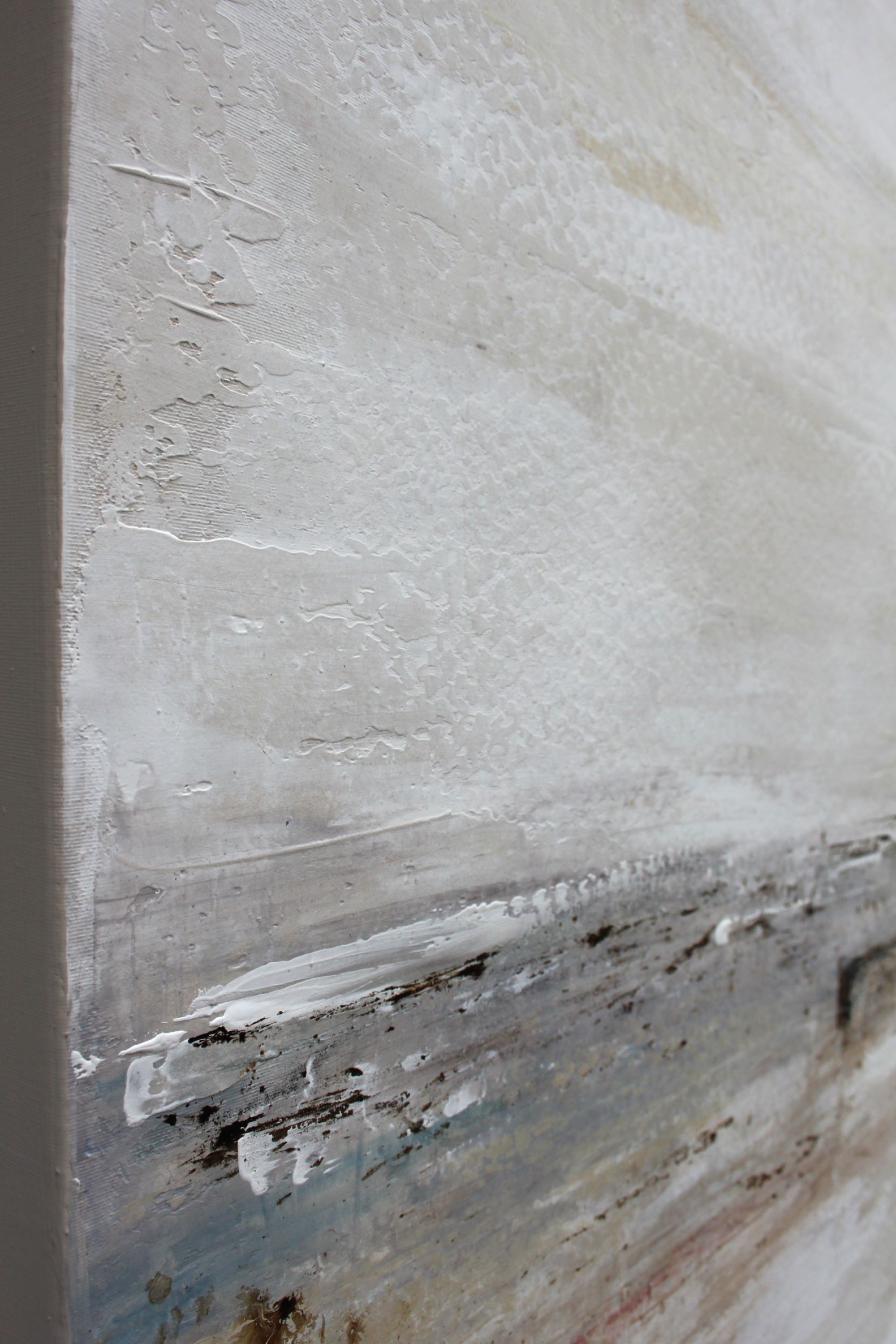 En la zona central, se distingue una banda más oscura, compuesta por grises y marrones terrosos. Los bordes de esta banda son irregulares y se desdibujan en el fondo más claro, creando una sensación de transición y falta de definición precisa. Dentro de esta banda oscura, también se observan sutiles variaciones de color y textura, añadiendo interés visual sin romper la serenidad general.