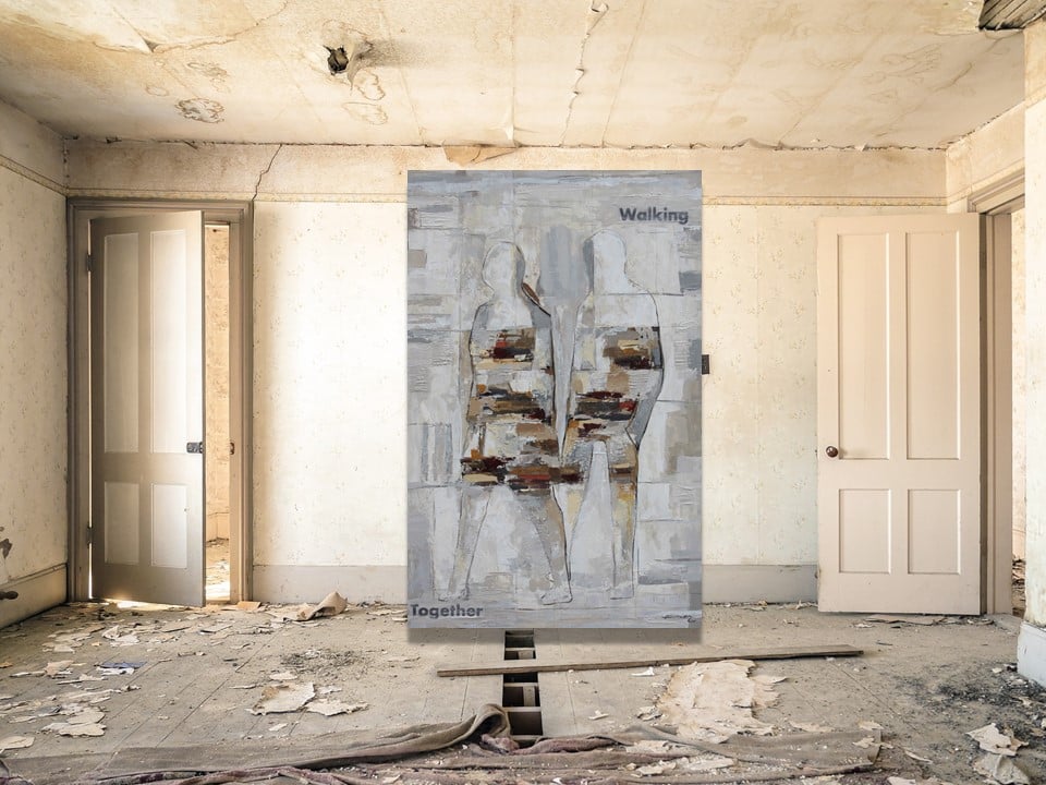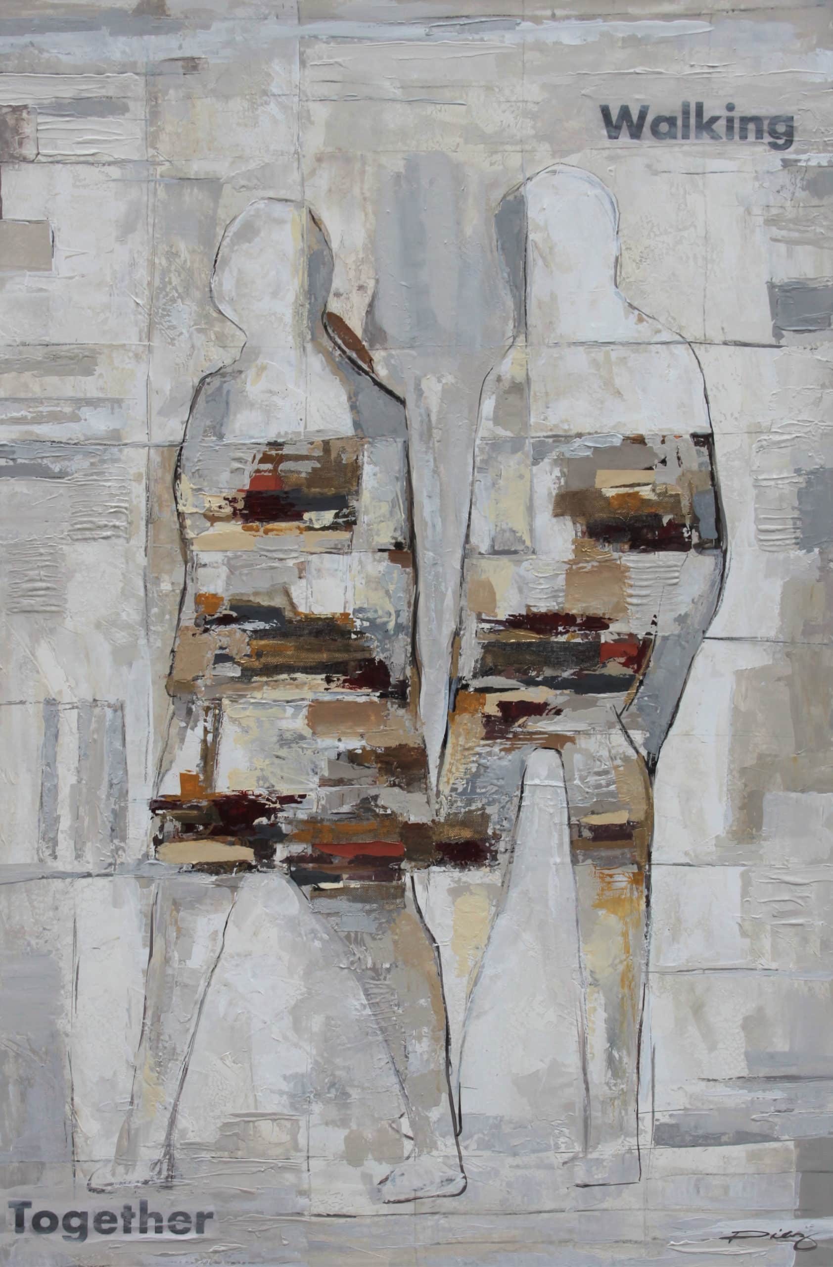 Cuadro original pintado a mano en acrílico sobre lienzo, con texturas. Fondo blanco roto, arena y gris , con un toque de marrones y pinceladas color teja y turquesas. Obra hecha con técnica collage y mucha textura con personalidad y carácter