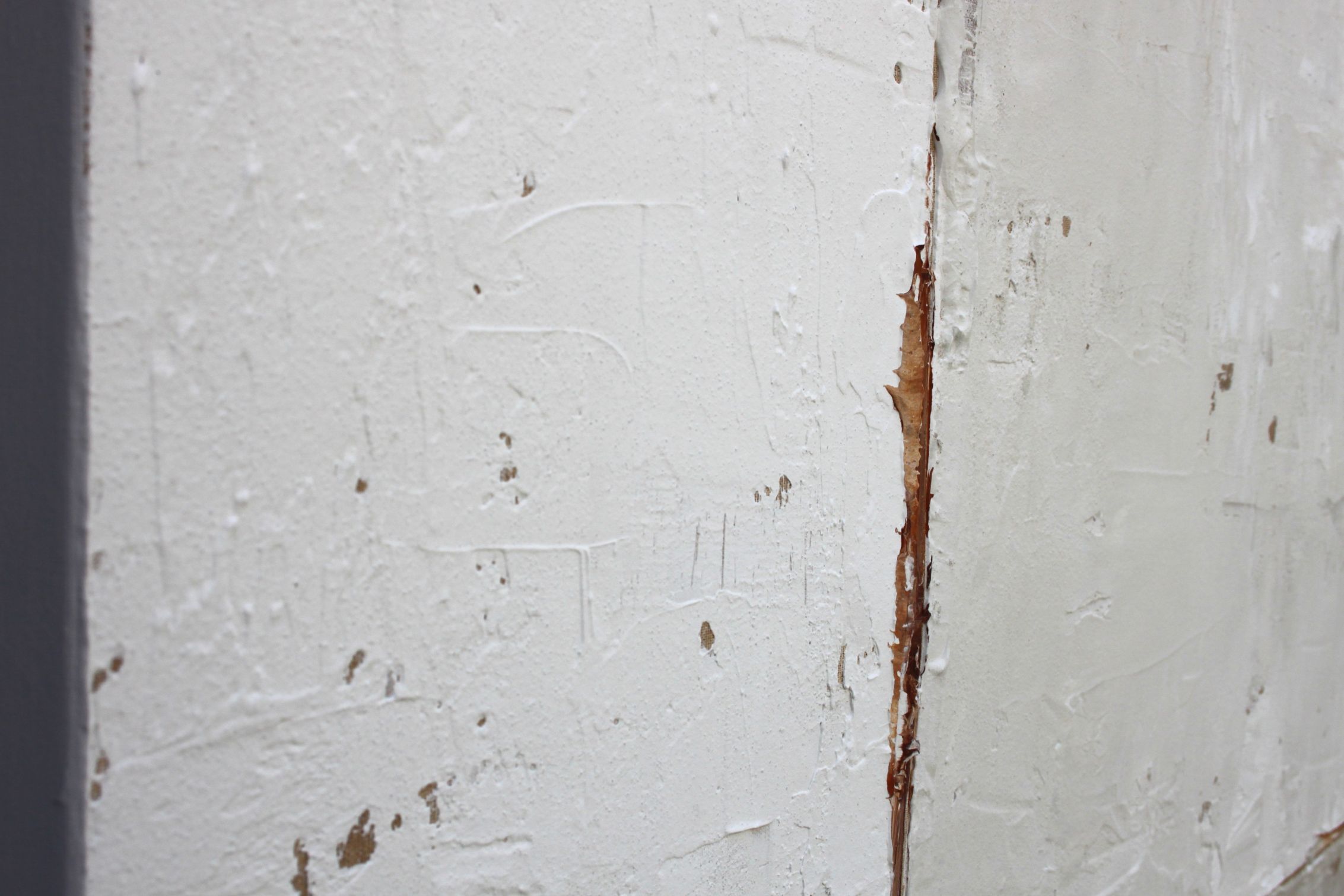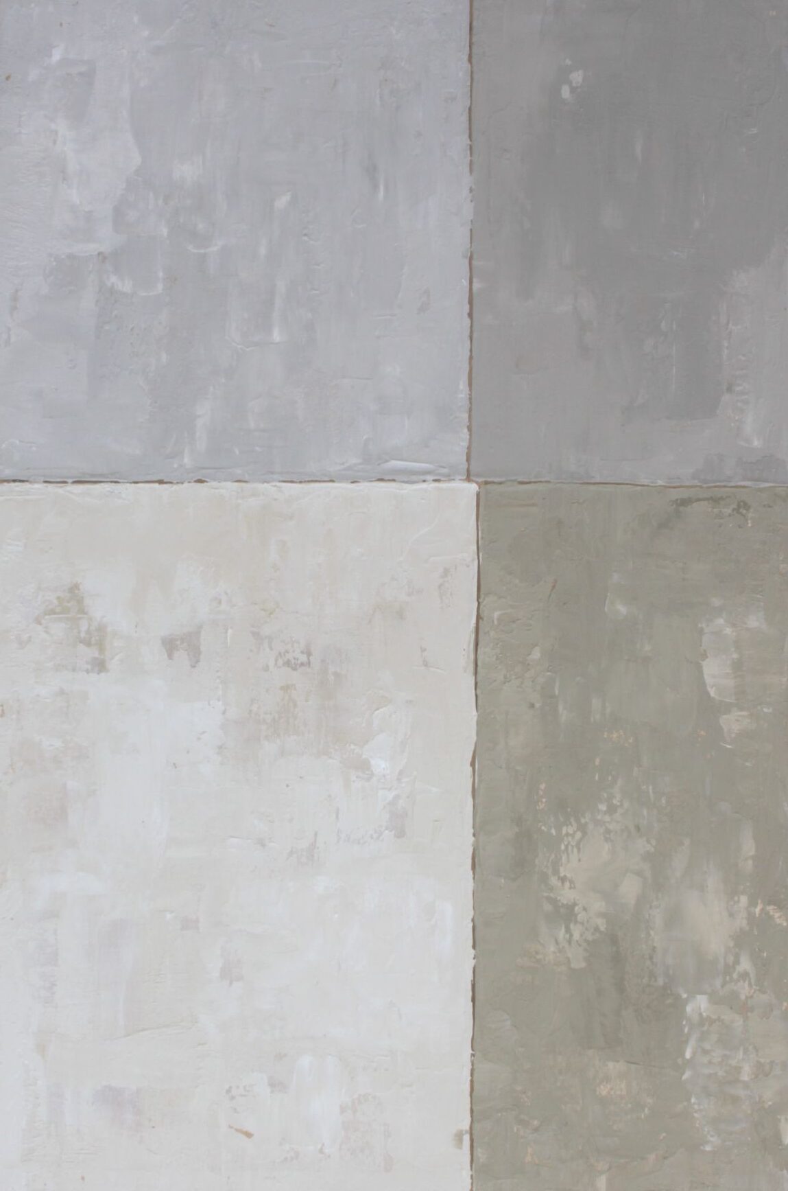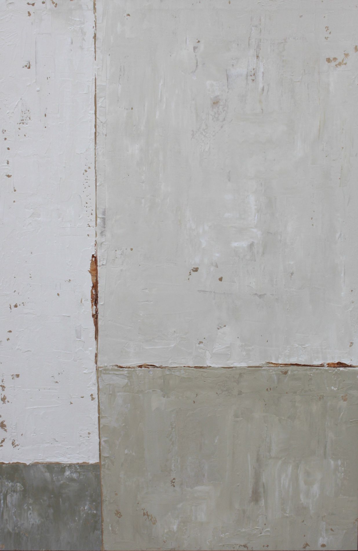 Este cuadro destaca por su composición dividida en bloques verticales y horizontales. La textura, aplicada con técnica de espátula, aporta relieve y carácter a la pieza. Los tonos predominantes son el blanco roto y el gris piedra, con sutiles detalles en color siena que marcan las líneas de división, evocando una estética industrial sofisticada.