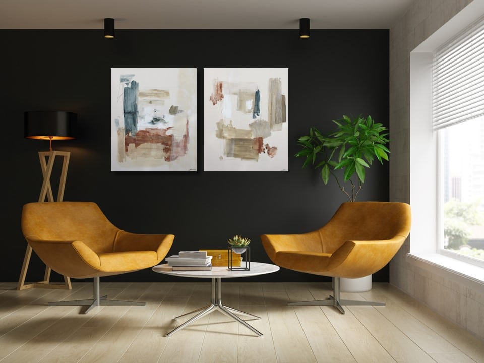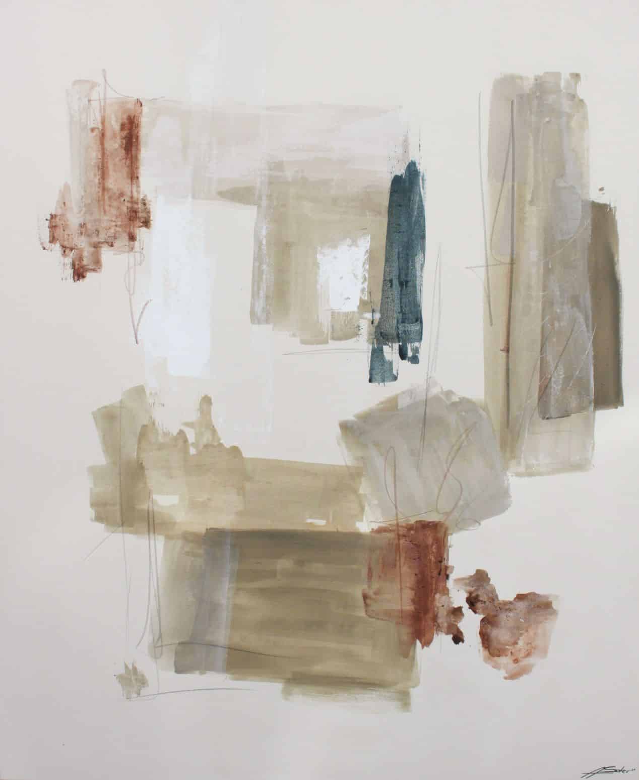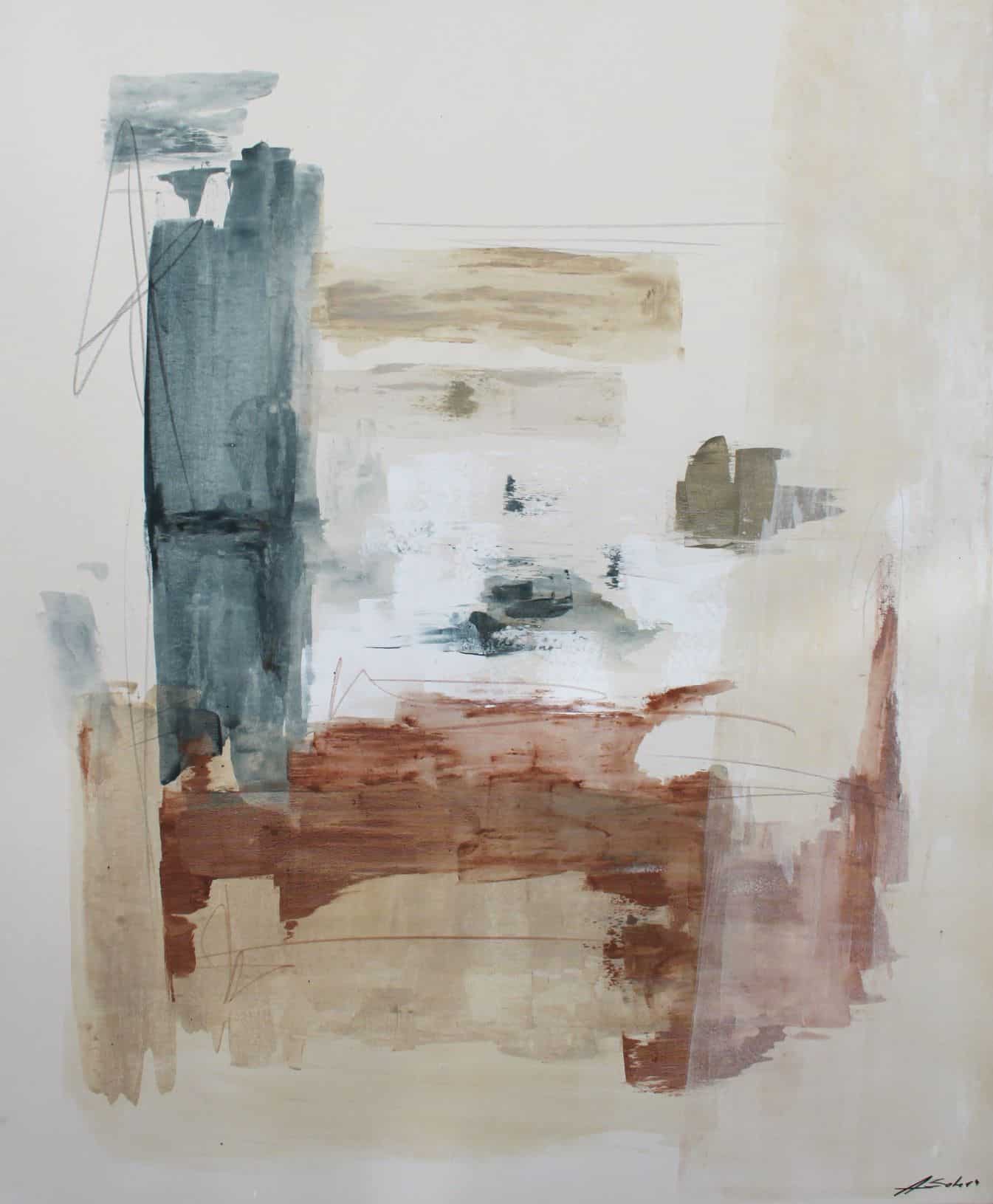 La paleta de colores, dominada por los tonos beige arena, evoca la calidez de la arena y la suavidad de la brisa. La ausencia de textura en este caso permite que los colores se fundan suavemente, creando una atmósfera serena y acogedora. El contraste lo aportan las pinceladas gruesas en azul, blanco, teja y verde piedra. Estas pinceladas, aplicadas con maestría, crean un juego de transparencias que resalta la profundidad de la composición y añade un toque de dinamismo a la obra. Los colores fríos y cálidos se entrelazan, creando una armonía visual que invita a la contemplación. El precio indicado en el desplegable incluye los dos cuadros.