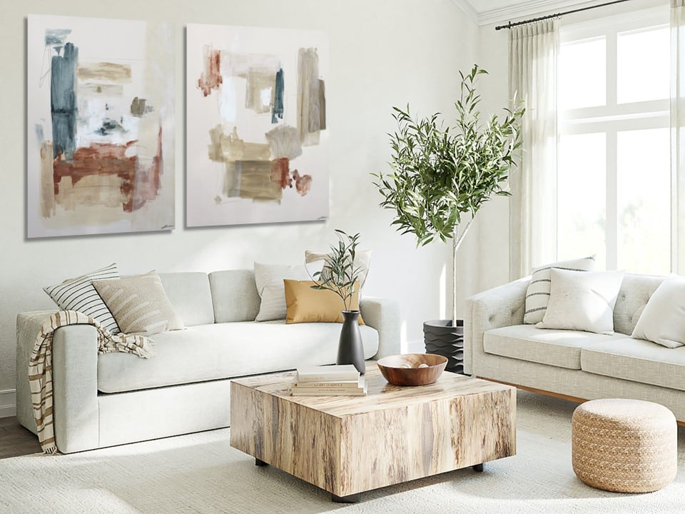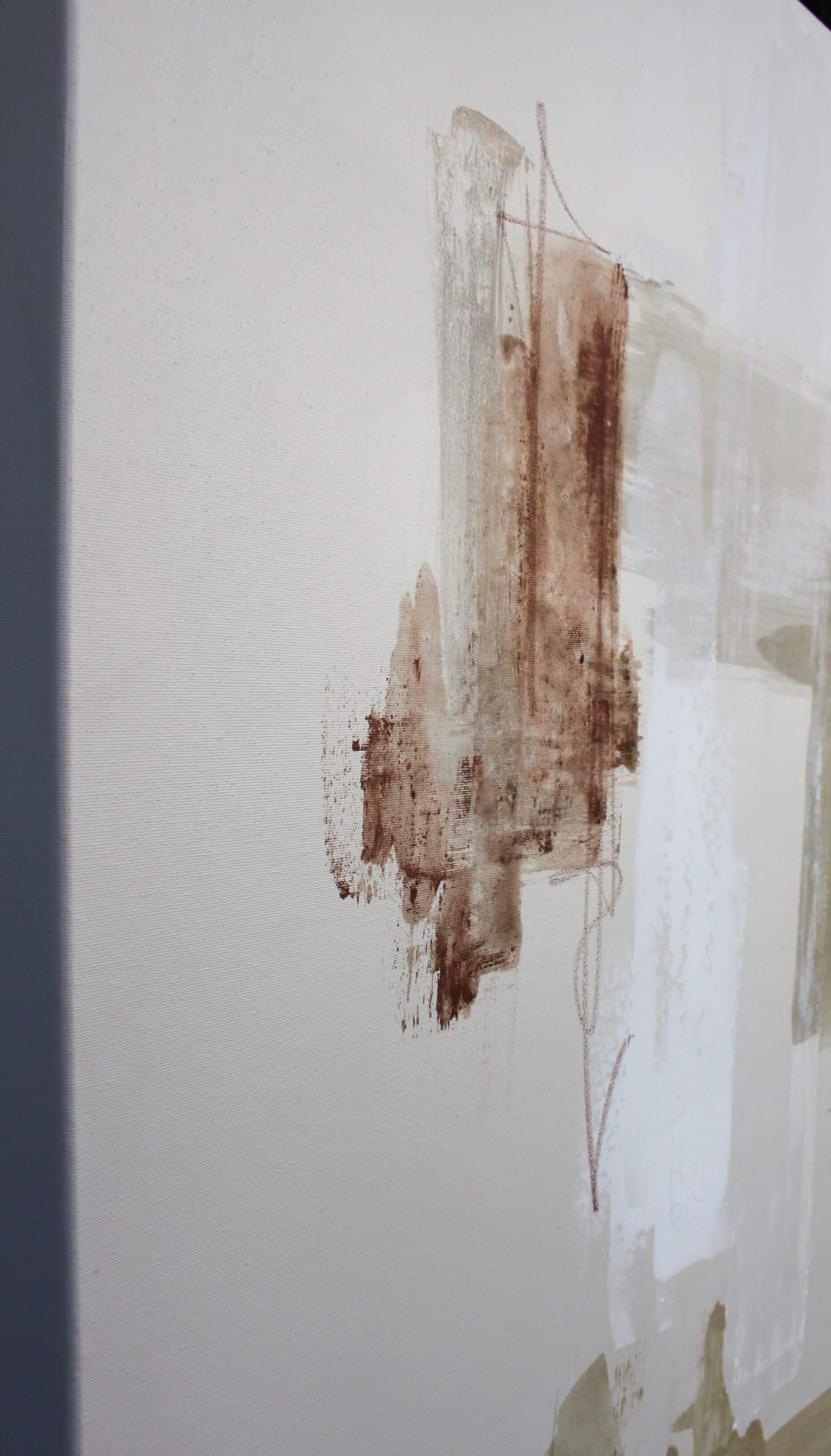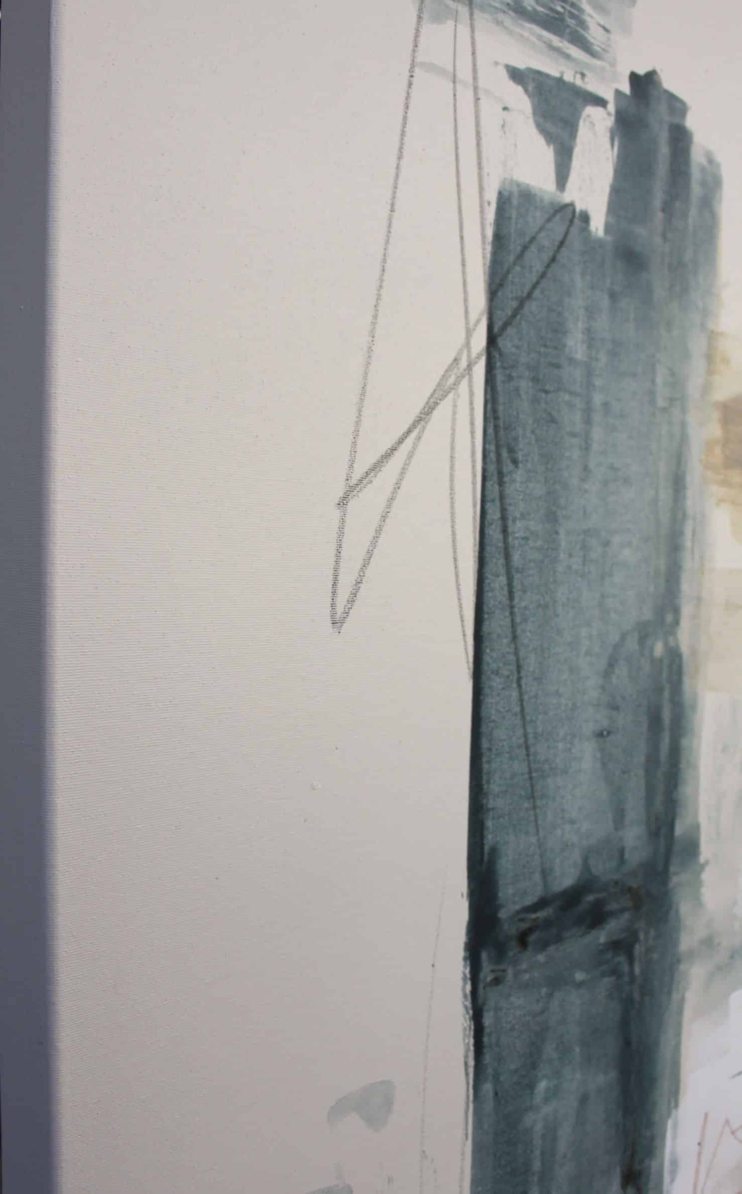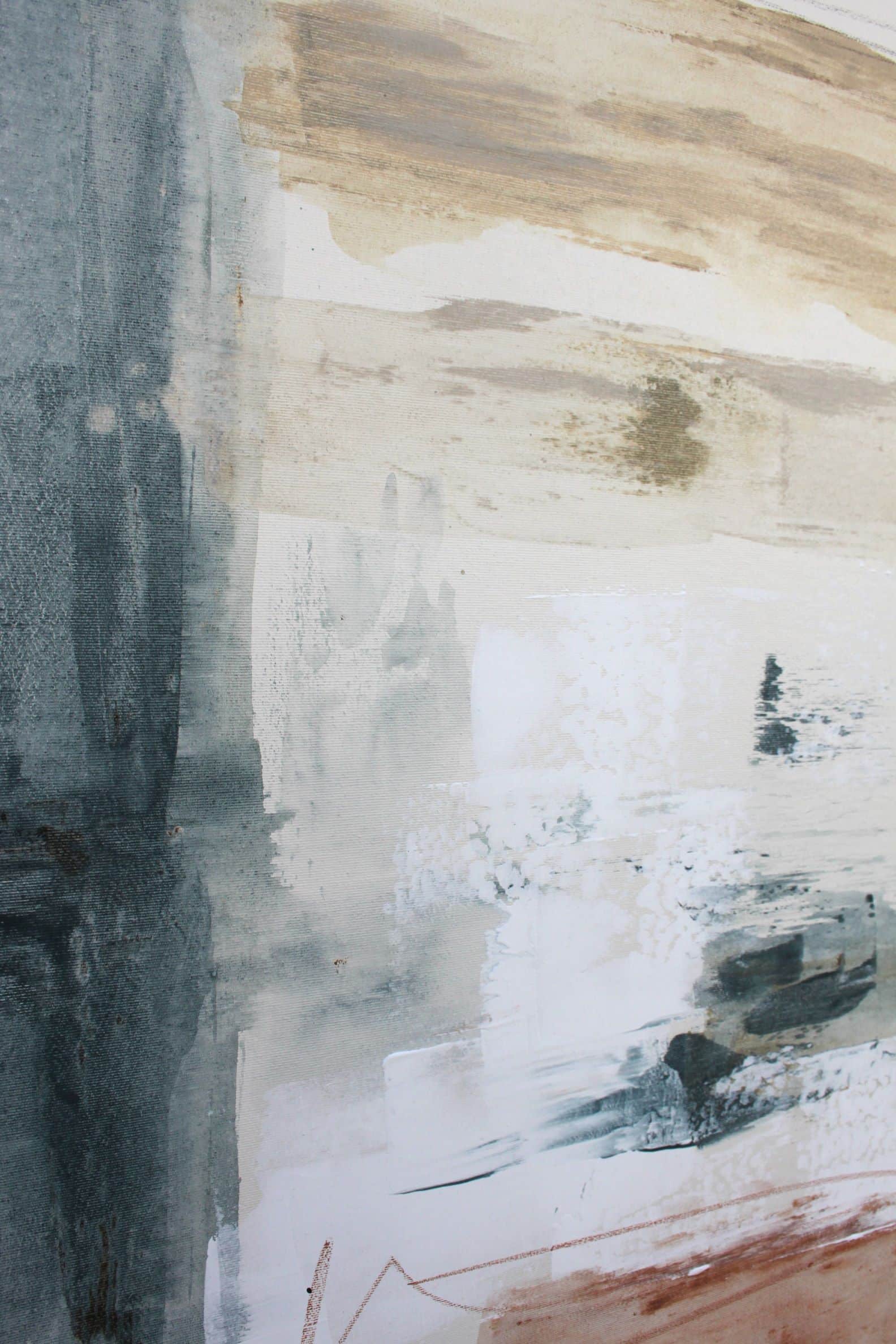 La paleta de colores, dominada por los tonos beige arena, evoca la calidez de la arena y la suavidad de la brisa. La ausencia de textura en este caso permite que los colores se fundan suavemente, creando una atmósfera serena y acogedora. El contraste lo aportan las pinceladas gruesas en azul, blanco, teja y verde piedra. Estas pinceladas, aplicadas con maestría, crean un juego de transparencias que resalta la profundidad de la composición y añade un toque de dinamismo a la obra. Los colores fríos y cálidos se entrelazan, creando una armonía visual que invita a la contemplación. El precio indicado en el desplegable incluye los dos cuadros.